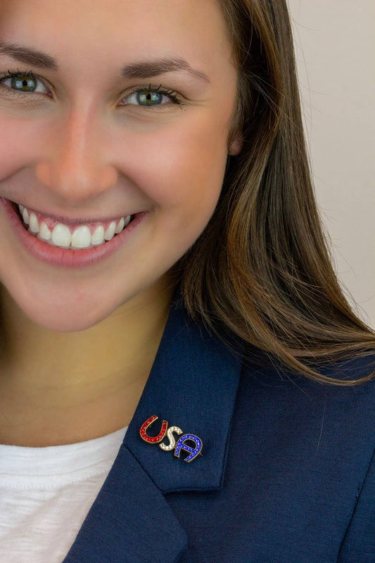 Proveedor:Anne Koplik Designs, Inc.Broche brillante estadounidense rojo, blanco y azul de estilo "americana".
