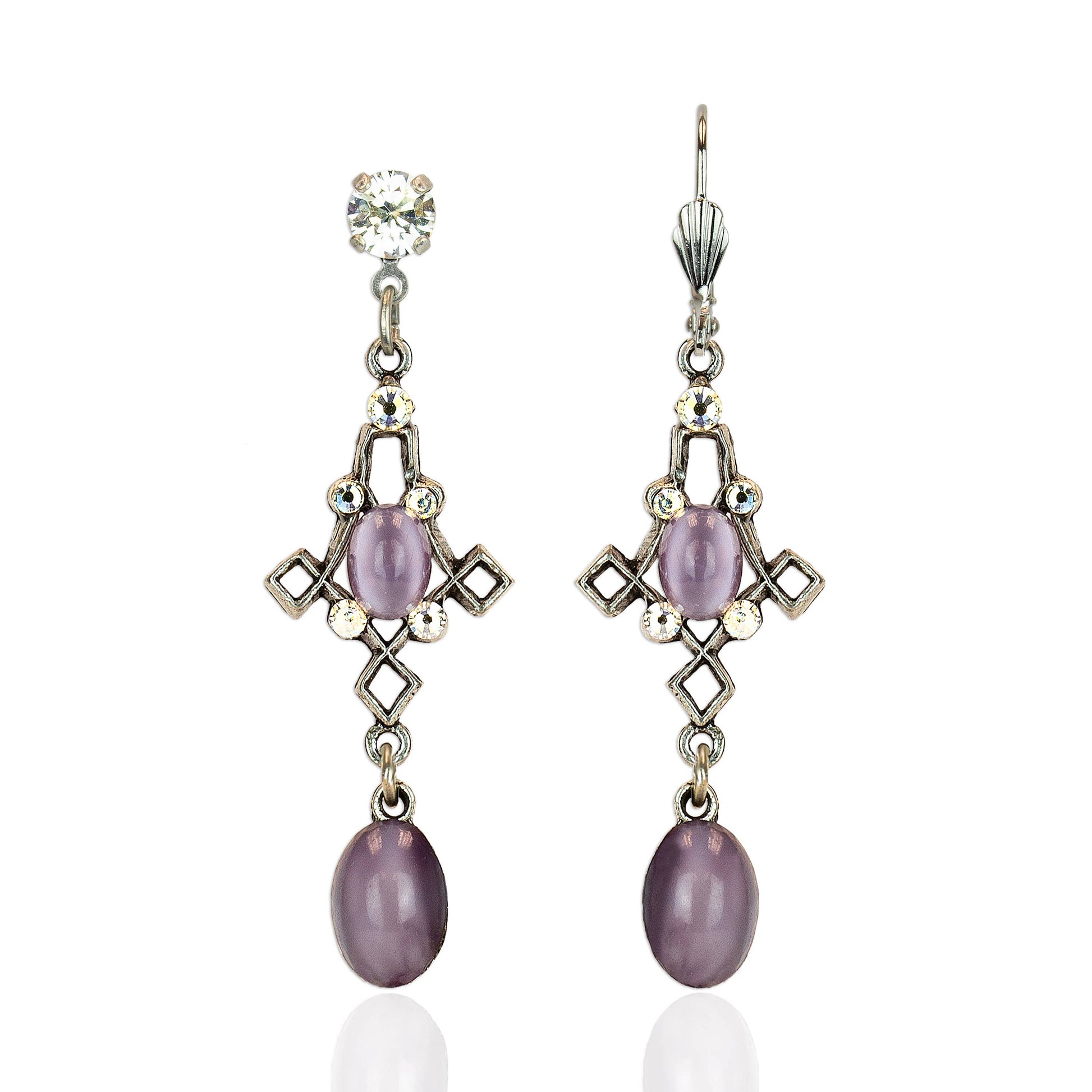 Los pendientes y colgantes de cristal ojo de gato color lavanda están elegantemente realzados con un romántico diseño y adornos de cristal, creando una apariencia elegante. Fabricados en EE. UU. con fundiciones de metal blanco chapado en plata envejecida sin plomo ni níquel. Los ganchos/clips de los pendientes están hechos de latón chapado en plata envejecida sin níquel ni plomo. Los postes son de acero quirúrgico. Medidas aproximadas desde la parte superior del gancho del pendiente: 3,2 cm (1 1/4") de largo x 1,6 cm (5/8") de ancho.