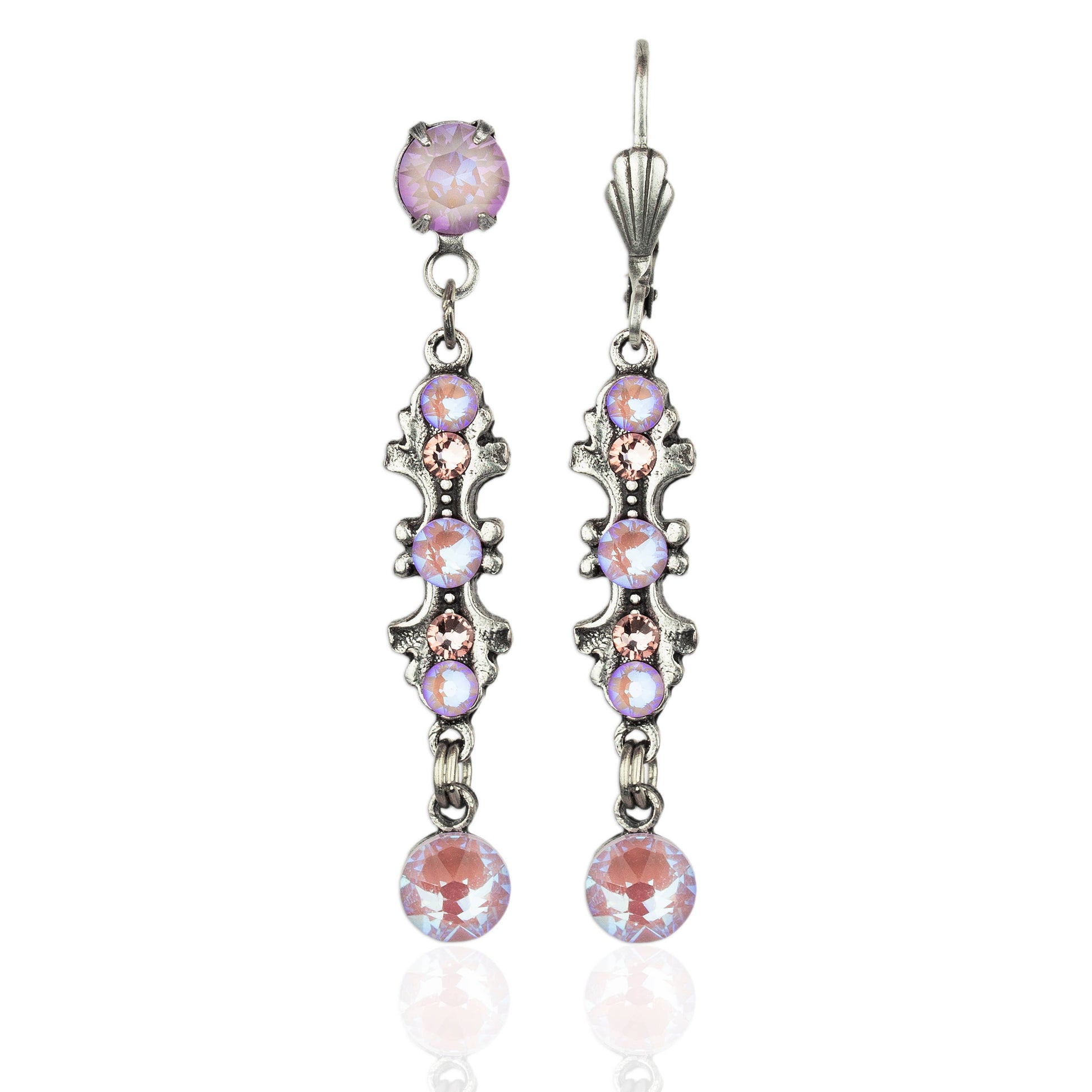 Añade un toque de brillo sonrojante a estos pendientes colgantes de inspiración vintage. Con barras ornamentadas con detalles y gotas de cristal, estos pendientes serán un complemento encantador para cualquier conjunto. Fabricados en EE. UU. con fundiciones de metal blanco plateado envejecido sin plomo ni níquel. Alambres/clips para pendientes hechos de latón plateado envejecido sin níquel ni plomo. Postes de acero quirúrgico. Colores de los cristales: rosa lavanda iridiscente, rosa empolvado claro. Medidas aproximadas (desde la parte superior del alambre del pendiente): 5 cm de largo x 0,6 cm de ancho.