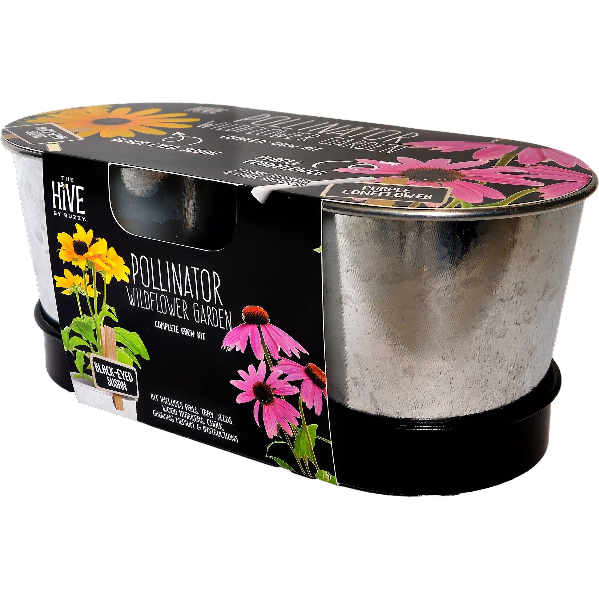 Pollinator Garden Grow Kit- (Black-Eyed Susan, Coneflower) includes 2 metal galvanized pails, metal tray, 2 wooden markers, chalk, seed packets, growing medium, and growing instructions