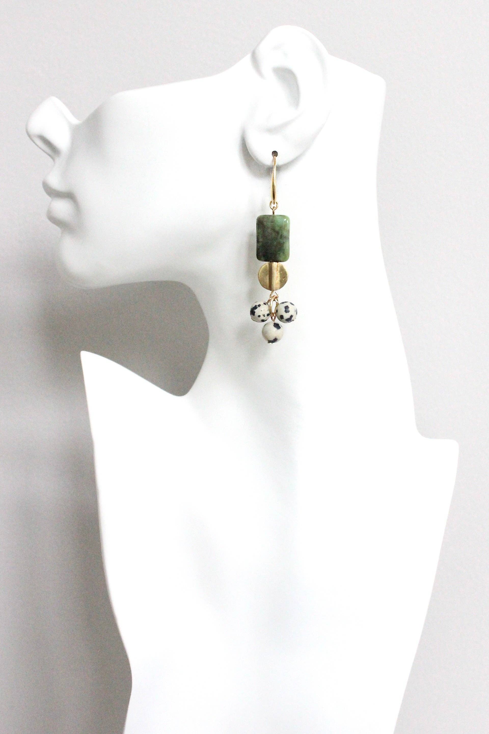 18k gold plated brass hooks with green jasper and Dalmatian jasper. Each half pair weighs .26 oz and measures 2.875 inches
