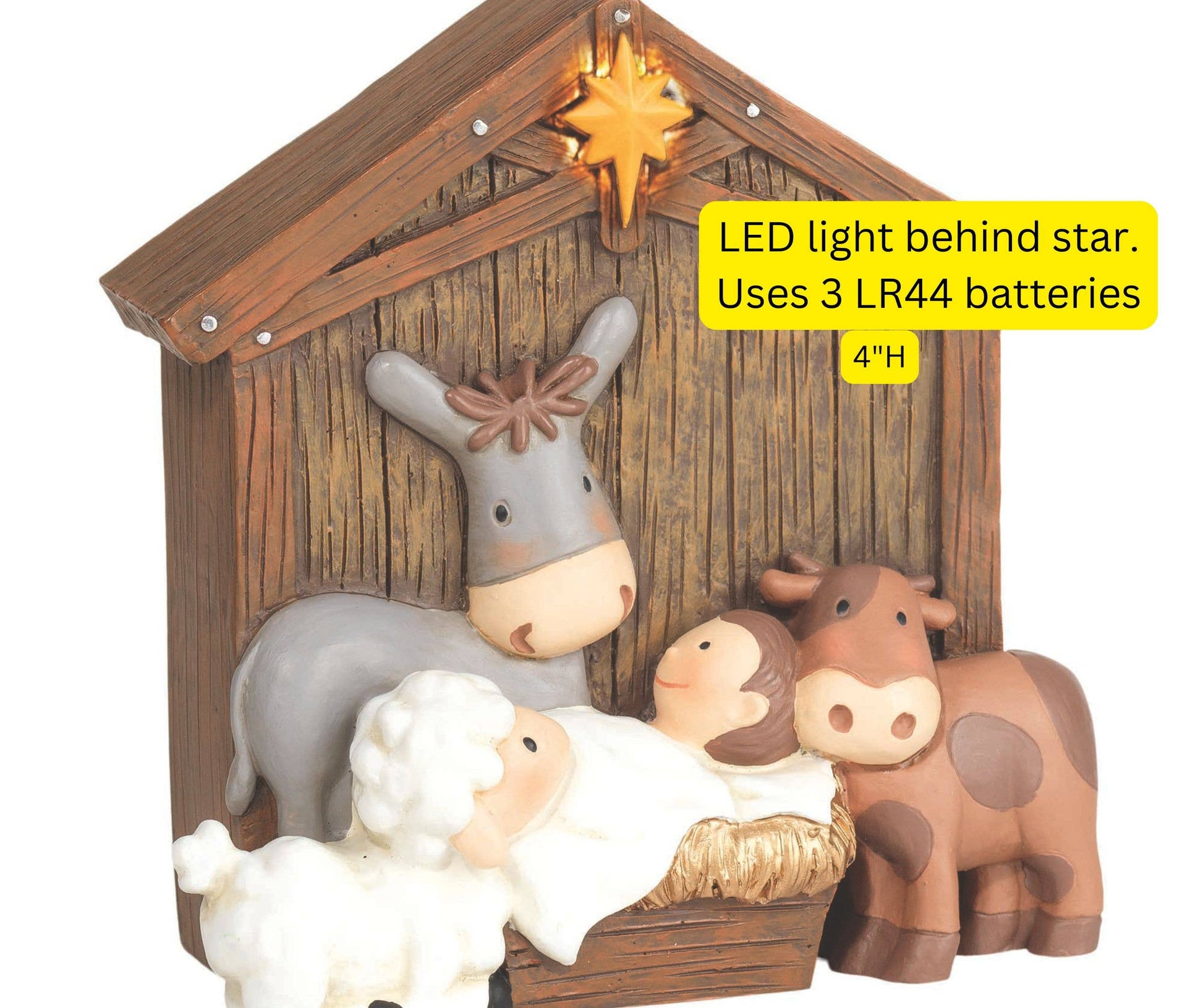 One Child, One Night Baby Jesus with Animals in Creche Lighted Figurine - Children, and the young at heart, will enjoy this adorable one piece nativity figurine. Baby Jesus and animals, along with wood creche, are nicely detailed. Best of all, there's an LED light behind the star. On/off switch on back. Uses 3 LR44 cell batteries, included. Engraved on back is the poem One Child, One Night. Figurine is resin; 4" high x 4" wide.