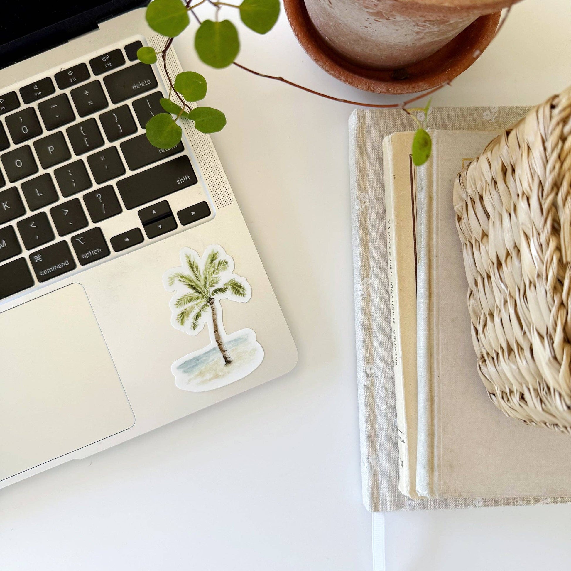 Añade un toque de encanto tropical donde quieras con esta vibrante pegatina de palmera. Perfecta para portátiles, botellas de agua o fundas de teléfono, aporta instantáneamente un ambiente relajado de isla a tus objetos cotidianos. Duradera y fácil de aplicar, esta pegatina te permite expresar tu amor por las playas soleadas y bordeadas de palmeras de una forma divertida y elegante. Añade esta pegatina a tu botella de agua, portátil, diario, sobres y mucho más. Detalles: - pegatina de vinilo - 7,6 cm x 5 cm - Ilustración original en acuarela de Emily Lex