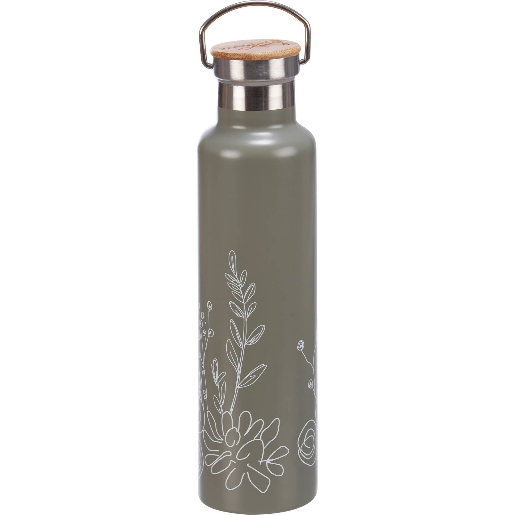 An insulated, double-walled stainless steel floral water bottle and coordinating lid with bamboo top layer. Featured in our Cottagecore Collection, our bottle displays hand illustrated design of wildflowers on matte green. Our Floral water bottle keeps beverages cold for 24 hours and hot for 12 hours. Hand-wash only and DO NOT MICROWAVE.