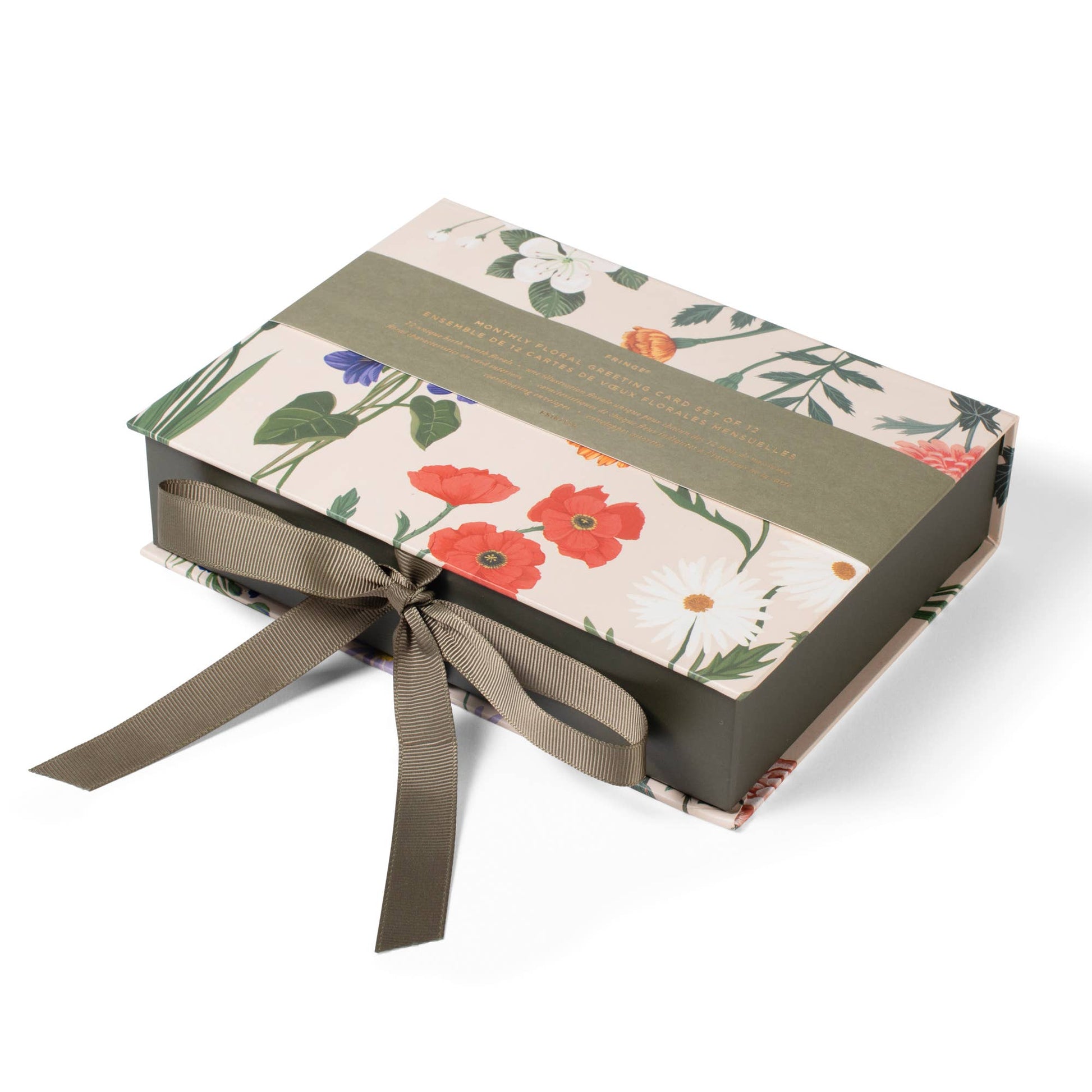 Set of 12 unique monthly floral greeting cards featuring exclusive artwork by Megan Galante with metallic gold foil stamping and coordinating envelopes. Notecards feature interior sentiment with characteristics of each monthly floral. Printed on cotton paper. Decorative gift box packaging with a ribbon tie is designed to be reused as a keepsake or storage box. Interior satin ribbon allows lid to stay vertical when open. CARDS: 5” w x 7” h; BOX: 8” w x 2” h x 6” d.