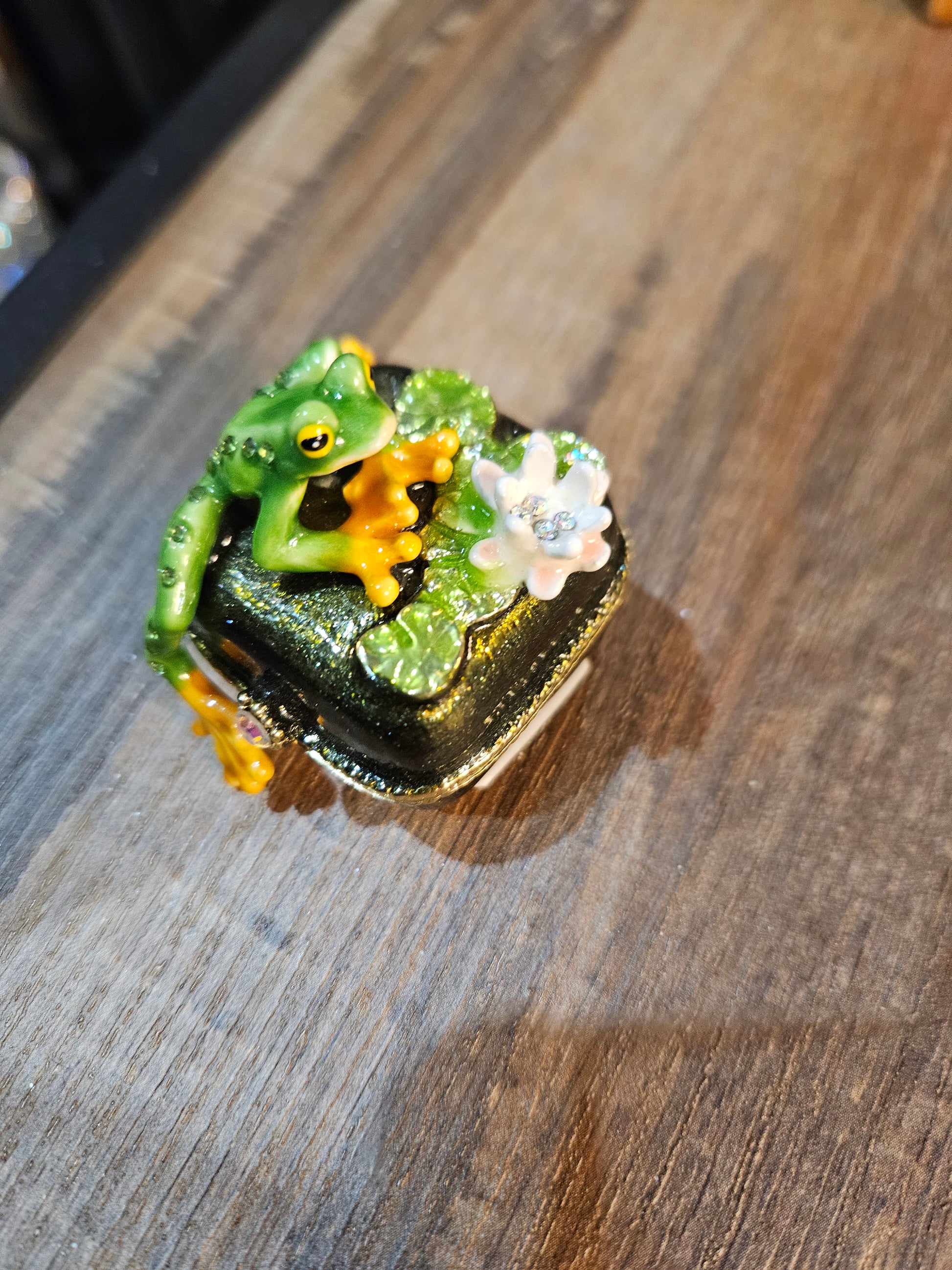 Experience the whimsical charm of our Frog with Flower Trinket Box! This adorable trinket box features a beautifully detailed frog resting on a delicate flower. Perfect for storing your small treasures and adding a touch of nature to your home decor. Makes a great gift for any frog lover!