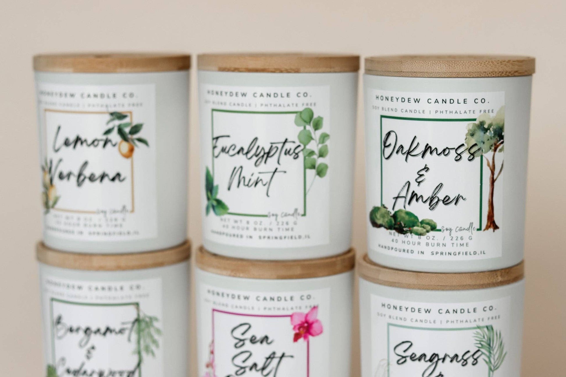 Fresh, crisp mint combines with base notes of lemons, verbena, and eucalyptus. Refreshing and clean! Natural, custom soy blend candle, handcrafted with care. Our candles burn longer and cleaner than most other candles. Produced in small batches to ensure the best quality! Our scents are created and tested to be sure our customers will be happy. HOW TO USE For the first time of use, it is important to burn the candle for a minimum of one hour for the wax to fully melt across the width of candle. This will ensure an even burn all the way down and provide the best possible scent. Phthalate Free, Prop 65 Free