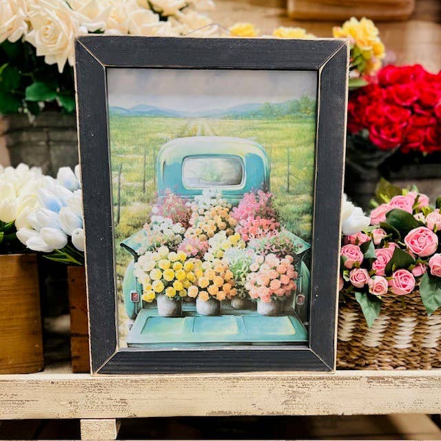 This picture is called "Flower Bed Truck". The print unframed measures 12x16 inches. The frame will add about one more inch per side. Beautiful print with multiple frame selections to choose from. This is a great print for any home with a vintage blue truck with a full bed of brightly colored flowers. All frames have a vintage wire along the top of the frame for quick and easy wall hanging.