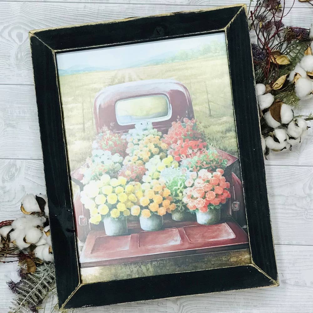 This picture is called "Fresh Picked". The print unframed measures 12x16 inches. The frame will add about one more inch per side. Beautiful print with multiple frame selections to choose from. This is a great print for any home with a vintage red truck with a full bed of brightly colored flowers. All frames have a vintage wire along the top of the frame for quick and easy wall hanging.