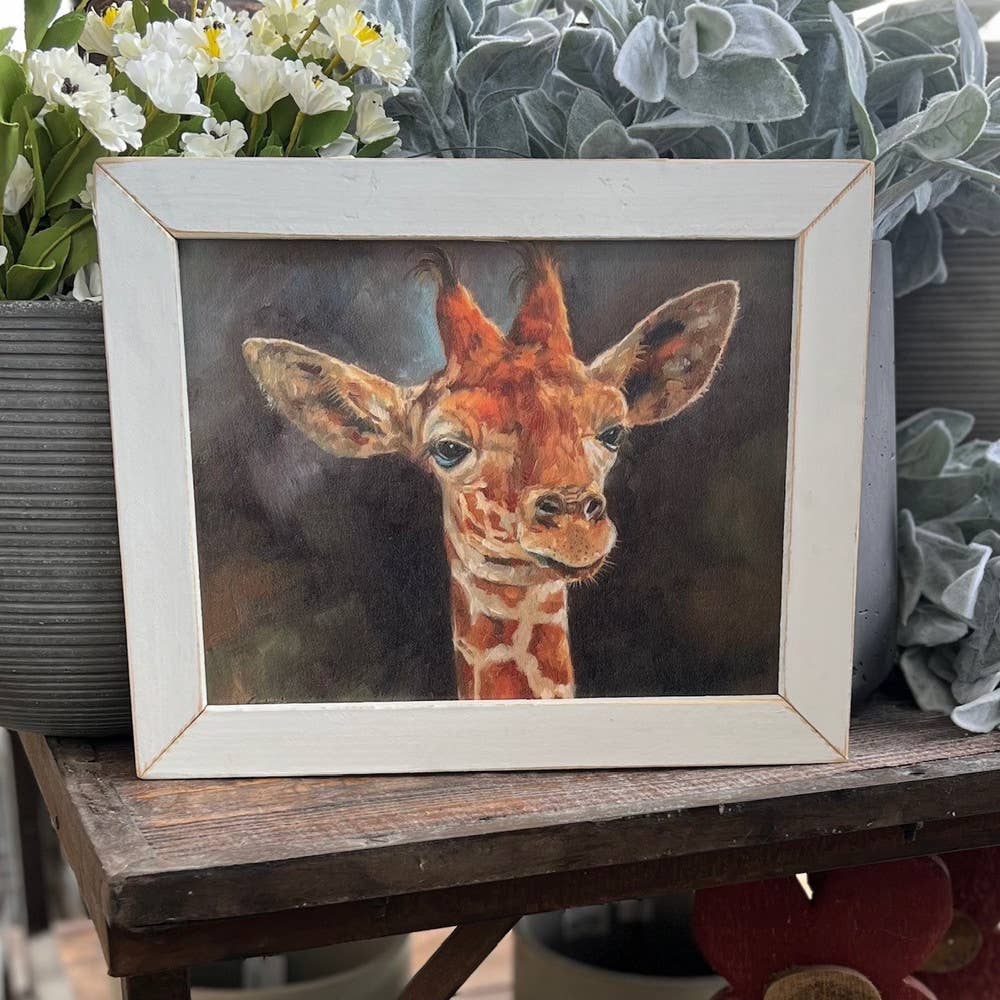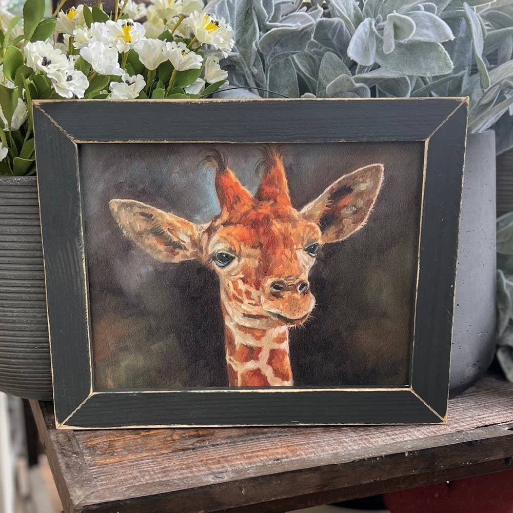This picture is called "Relaxed Randy". The print unframed measures 11x14 inches. The frame will add about one more inch per side. Beautiful print with multiple frame selections to choose from. This is a great print of a giraffe named Randy who is looking very relaxed! A great print for any giraffe lover! All frames have a vintage wire along the top of the frame for quick and easy wall hanging.