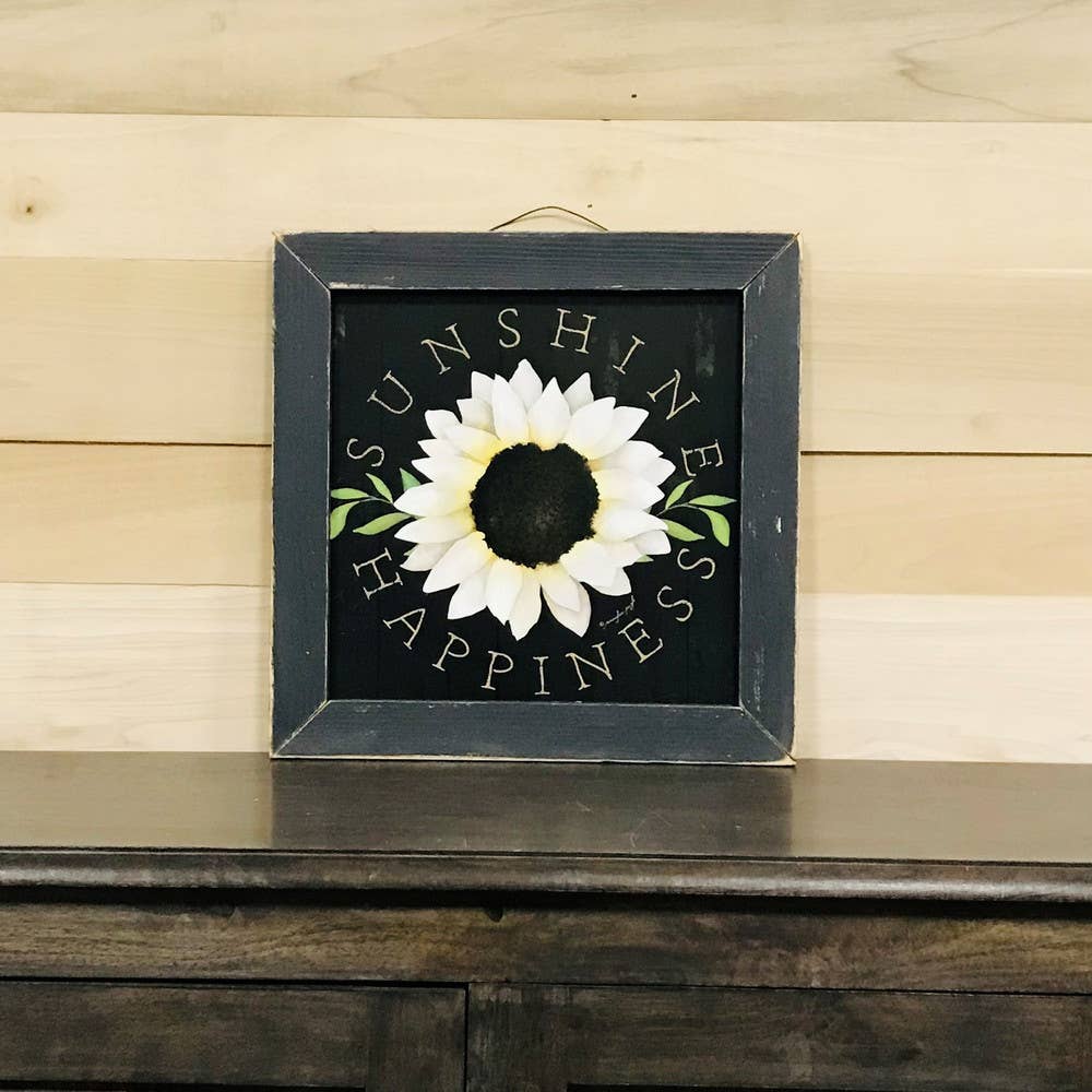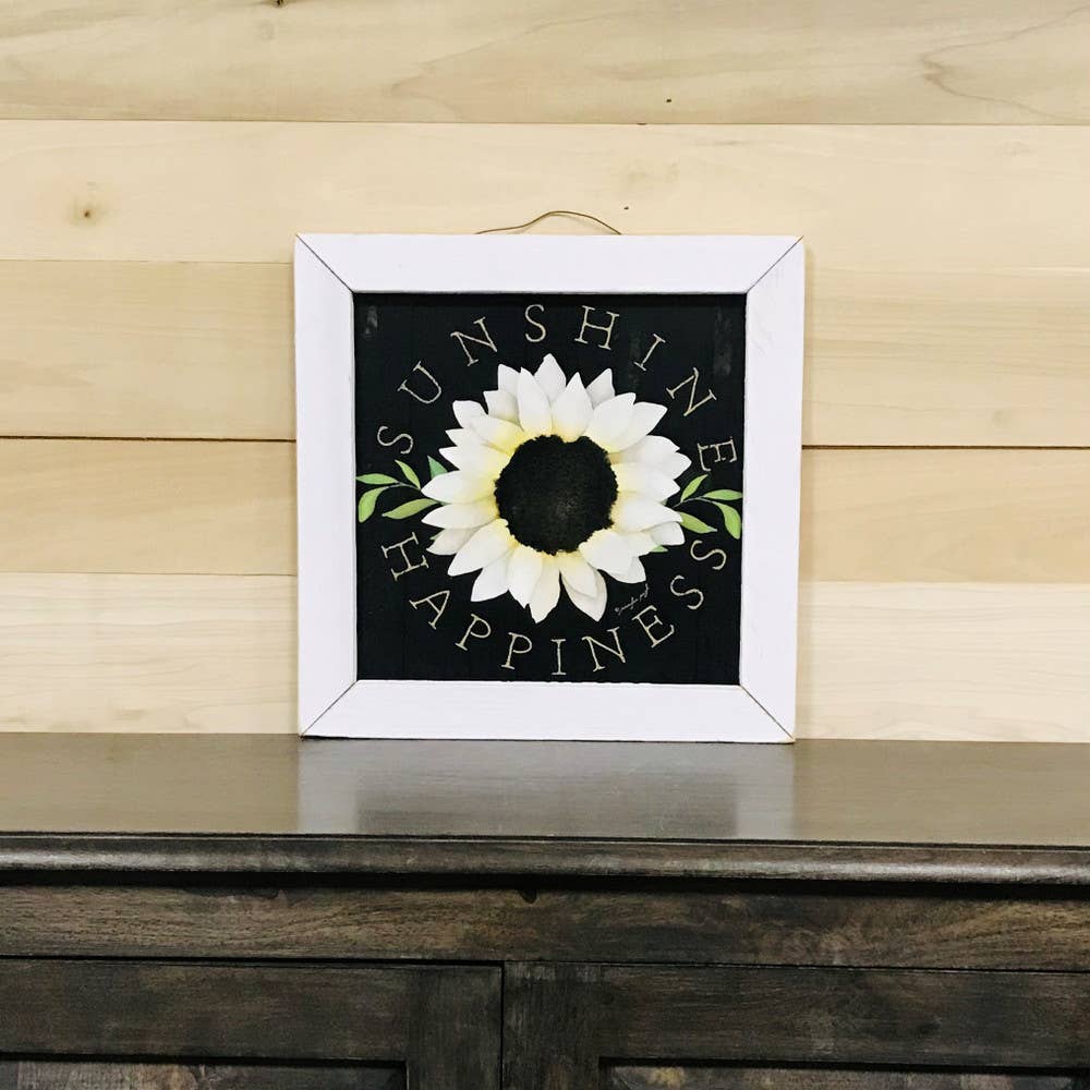 This picture is called "Sunshine Happiness". The print unframed measures 12x12 inches. The frame will add about one more inch per side. Beautiful print with multiple frame selections to choose from. This print has a dark background with a white flower with a dark center and reads, "Sunshine Happiness." All frames have a vintage wire along the top of the frame for quick and easy wall hanging.