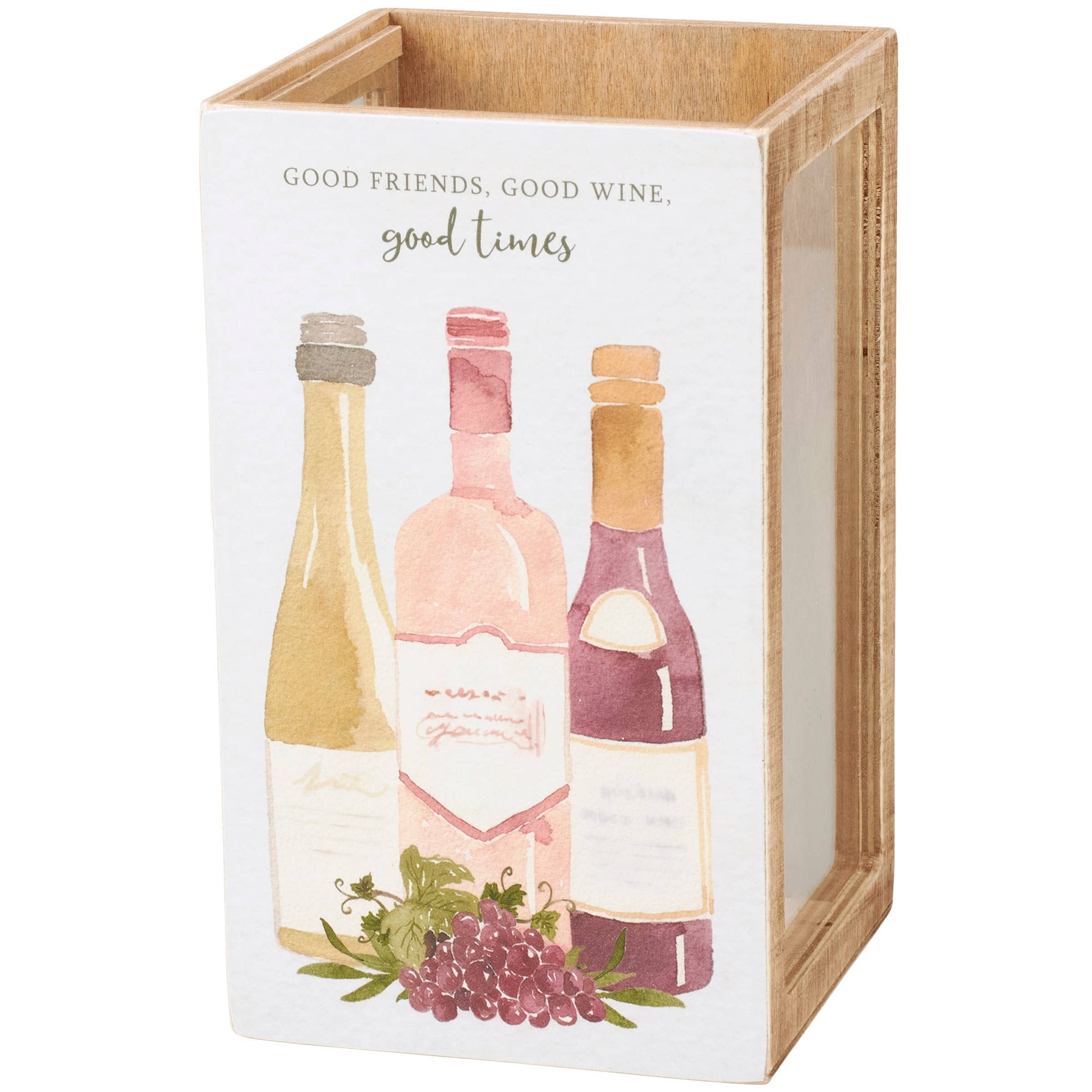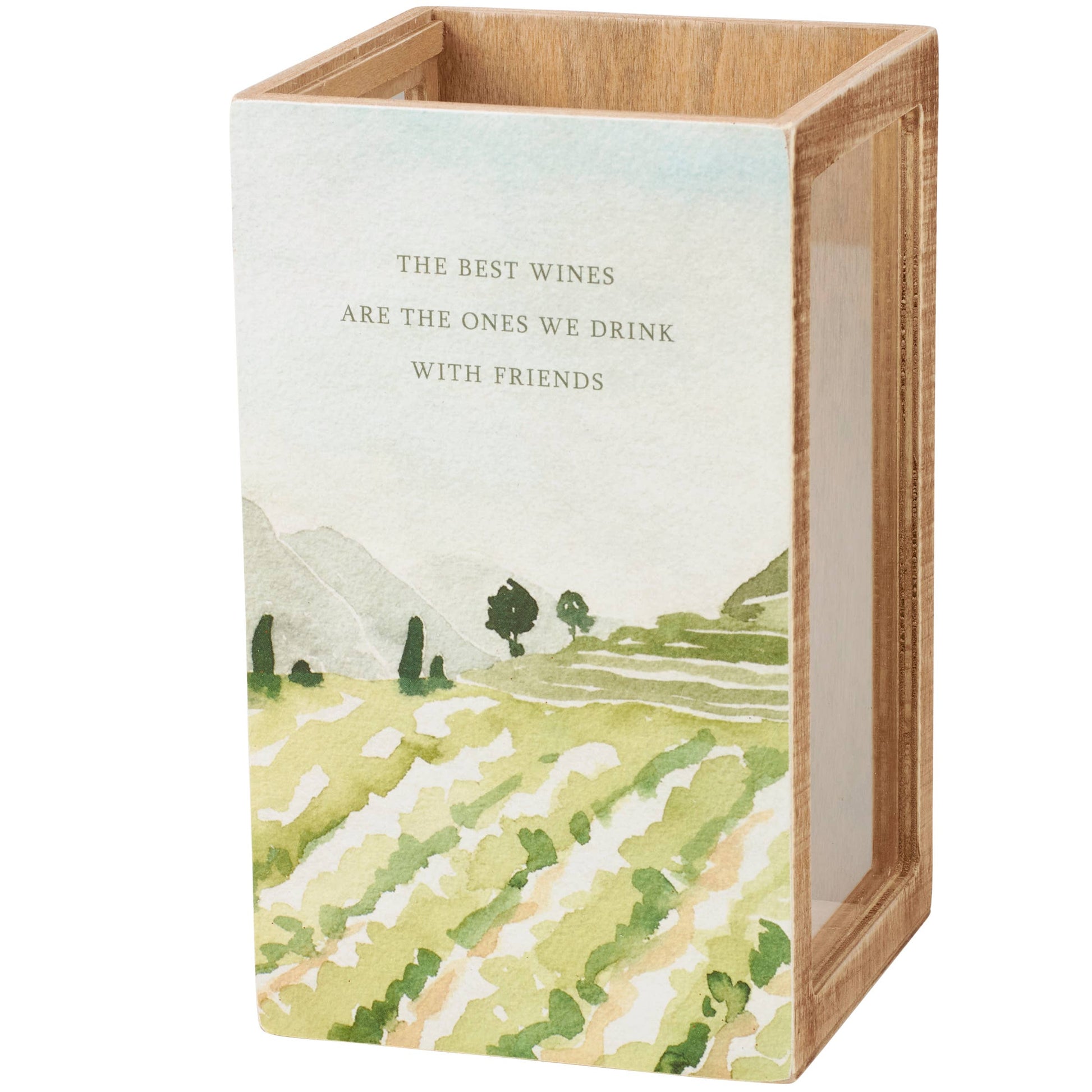 A double-sided cork holder from our Alcohol Collection featuring two display options of hand painted designs in a watercolor style with glass windows on the sides to view corks stored inside. Cork holder displays a wine bottles design with "Good Friends, Good Wine, Good Times" sentiment on one side and vineyard design with "The Best Wines Are The Ones We Drink With Friends" sentiment on the other side. Our Good Times cork holder can be used to collect used corks or elegantly display a bottle of wine. A lovely home accent with functional style.