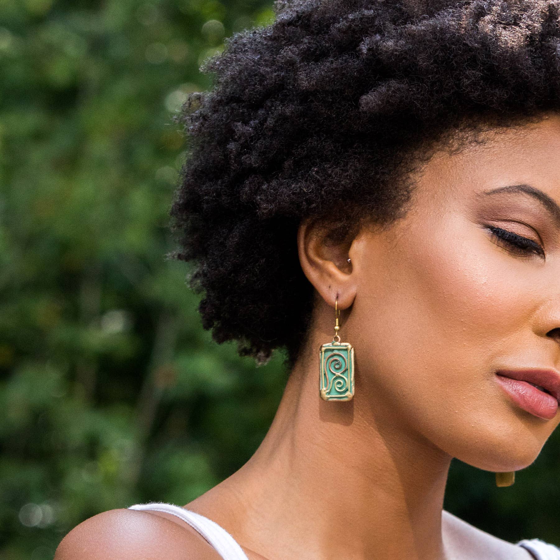 Elevate your style with these Brass Patina Earrings featuring a captivating green finish and an elegant double spiral design. Lightweight and artisan-crafted, they add a unique touch of vintage charm to any outfit. Perfect for those who appreciate distinctive accessories that blend timeless beauty with modern flair. Brass patina earrings; made with brass and copper coated with patina. Handmade by artisans in India.