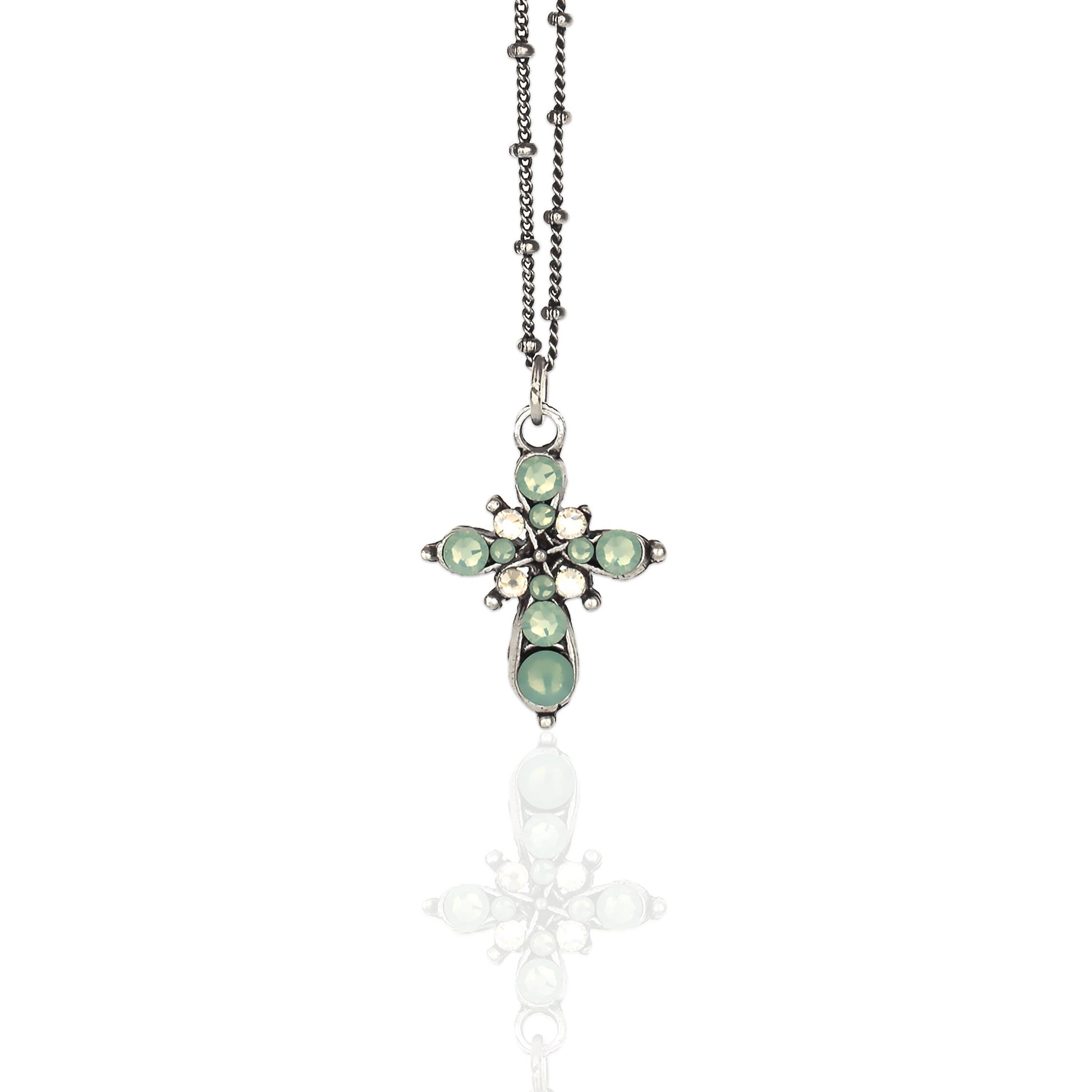 Spring opals bring life to this vintage inspired cross necklace. Featuring crystal accents in three color styles, this pendant will coordinate with any of your favorite looks. Made in the USA with lead/nickel free antiqued silver-plated white metal castings and chain. Lobster claw closure. Available Crystal Colors: sky blue opal/iridescent crystal; pacific green opal/iridescent crystal; white opal/iridescent crystal Measures Approximately: Pendant 1" L x 11/16" W; Chain 16-18" adjustable