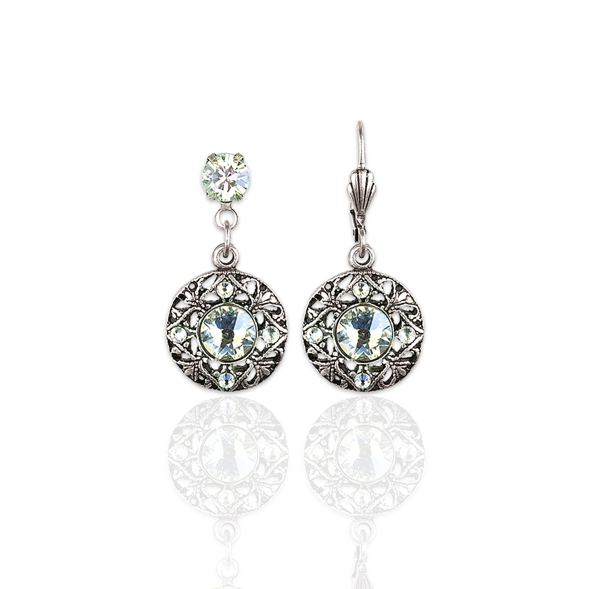 Versatility shines in these round filigree dangles. Featuring a crystal framed by delicate metalwork, accented with more crystals, these beauties go from day to night in a sparkle. Made in the USA with antiqued lead/nickel free silver-plated white metal castings. Earring wires/clips made of nickel/lead free antiqued silver-plated brass. Posts made of surgical steel. Available Crystal Colors: blush rose, cool green, aqua, shimmering crystal, navy blue, red, vibrant lavender Measures Approximately (from top of earring wire): 1 3/8" L x 5/8" W