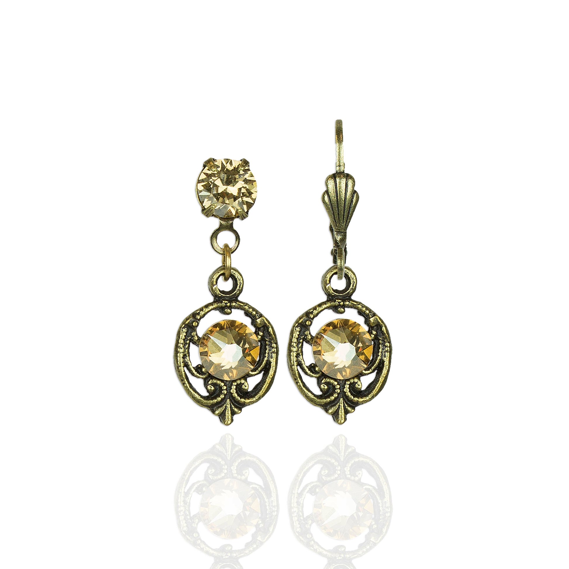 Exhibit some subtle sophistication with these dainty dangles. Featuring a single crystal enveloped by a scroll design, these tiny earrings will pack the perfect punch. Made in the USA with antiqued lead/nickel free brass plated white metal castings. Earring wires/clips made of nickel/lead free antiqued brass. Posts made of surgical steel. Measures Approximately (from top of earring wire): 1 1/4" L x 7/16" W
