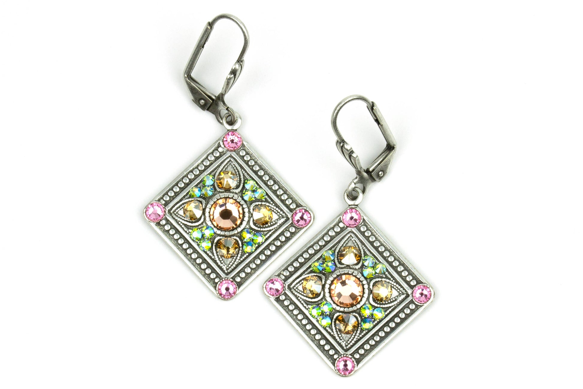 Versatility and glimmer combine in these vintage inspired rhombus shaped dangles. Featuring intricate details with a beaded edge and pastel crystal accents, these earrings make the perfect addition to any outfit. Made in the USA with antiqued lead/nickel free silver-plated brass findings. Earring wires/clips made of nickel/lead free antiqued silver-plated brass. Posts made of surgical steel. Crystal Colors: light rose, iridescent light green, light peach, shimmering golden crystal Measures Approximately (from top of earring wire): 1 3/4" L x 1" W