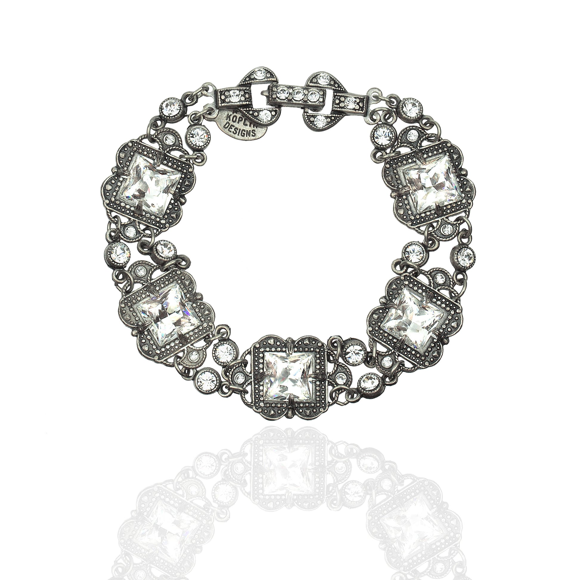 Treat yourself to some arm candy in this vintage inspired link bracelet. Featuring five brilliant princess cut crystals in beaded quatrefoil settings, with handset crystal spacers and a crystal crusted clasp, this piece is perfect for special occasions from evening to bridal. Made in the USA with lead/nickel free antiqued silver-plated white metal castings. Fold over clasp. Crystal Color: clear crystal Measures Approximately: 6 7/8"L