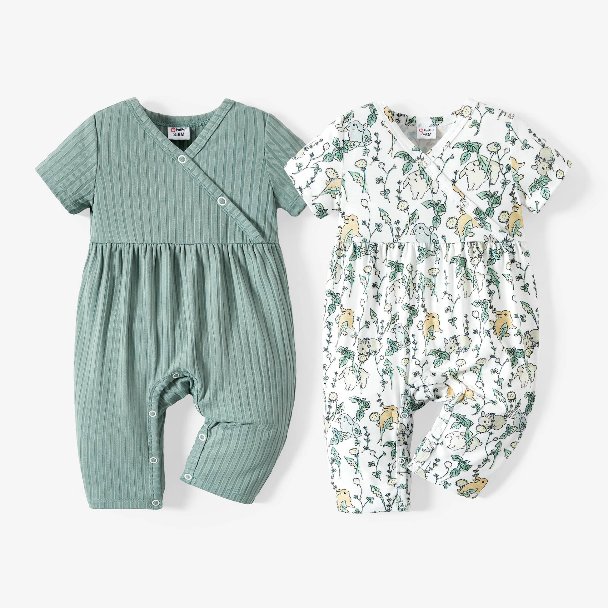 Baby Girl All Over Rabbit Solid Ribbed V Neck Jumpsuit
