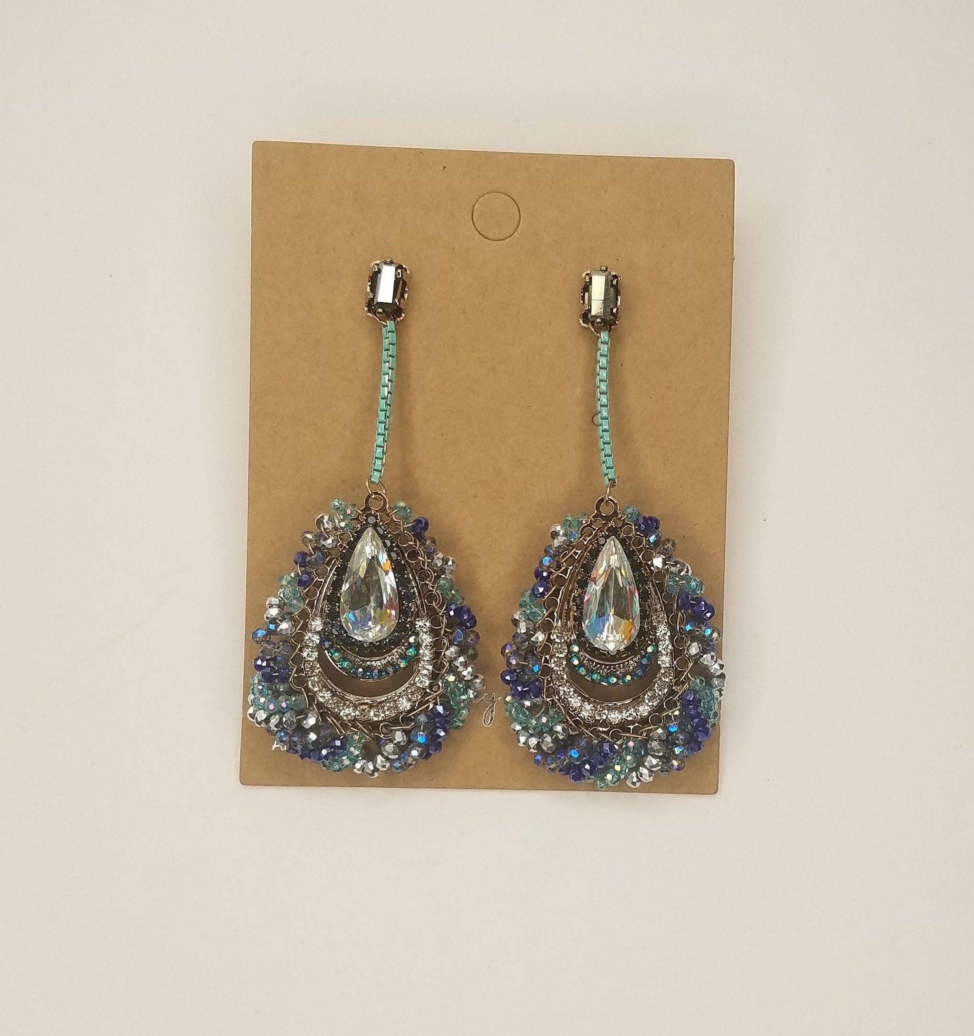 Gem Peacock Hand Made Dangle Earring. Material: Silver Post, Cubic Zirconia, Swarovski Elements, Rhinestone, Metal Beads, Lead & Nickel Free. Length: 2.56" Width: 1.14"