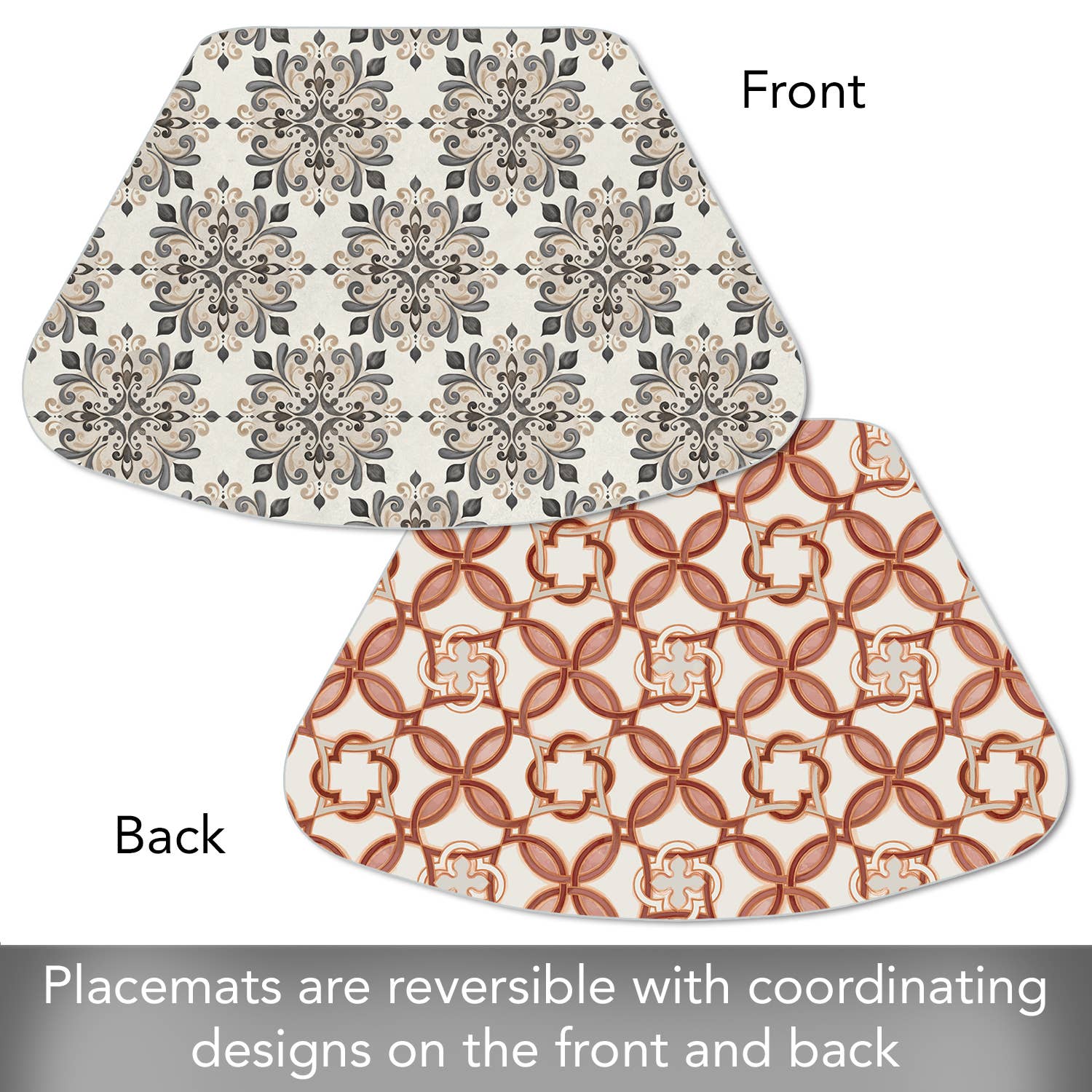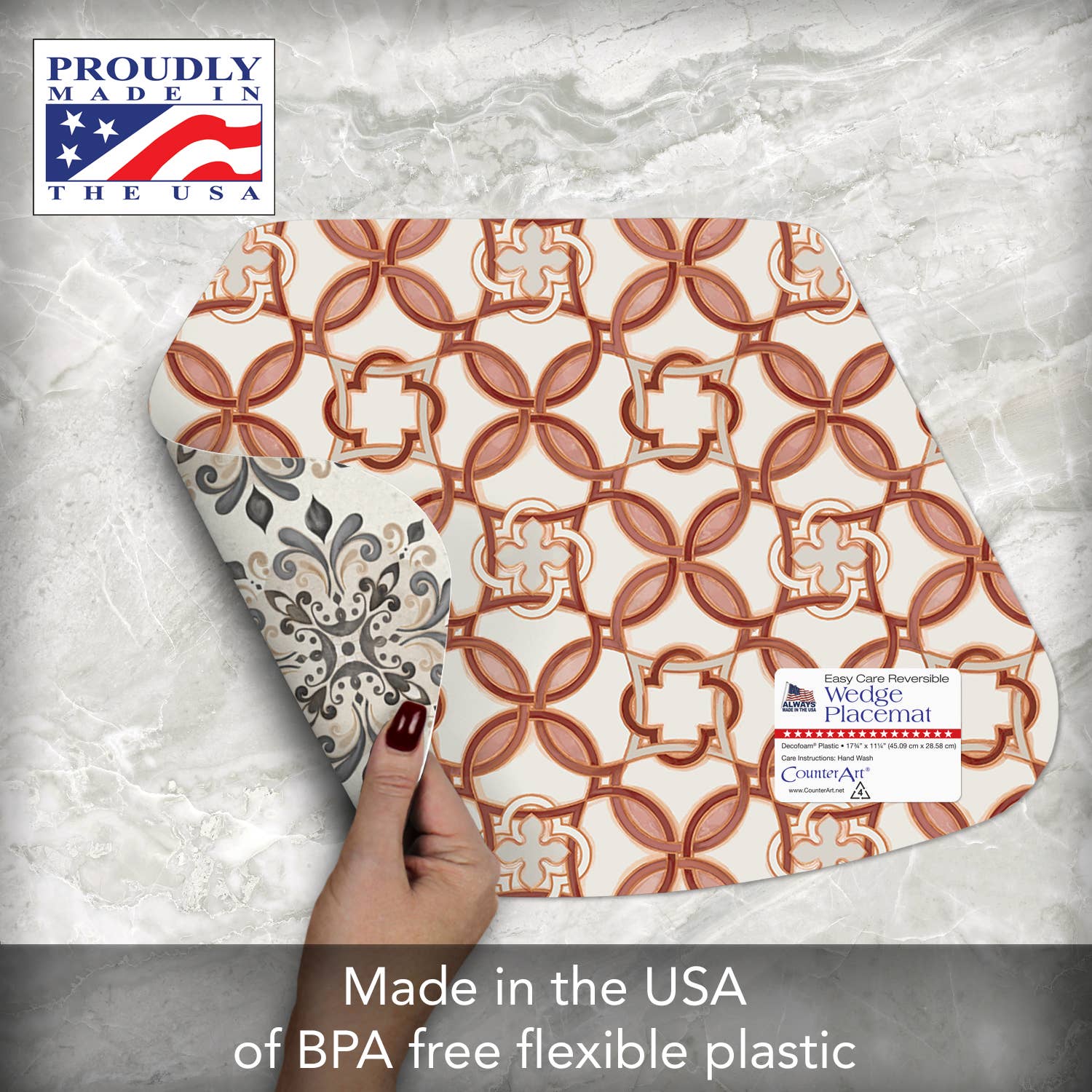 Wedge Shaped Placemats. Made in the USA. Printed on both sides with coordinating designs. Wedge shape fits perfectly on round table. Easily wipes clean with damp cloth and mild detergent. Assists in protecting your surfaces from scratches and stains. Beautiful Artistic designs allows the Placemats to remain displayed even when not in use. Measures 17.75 inches by 11.25 inches.