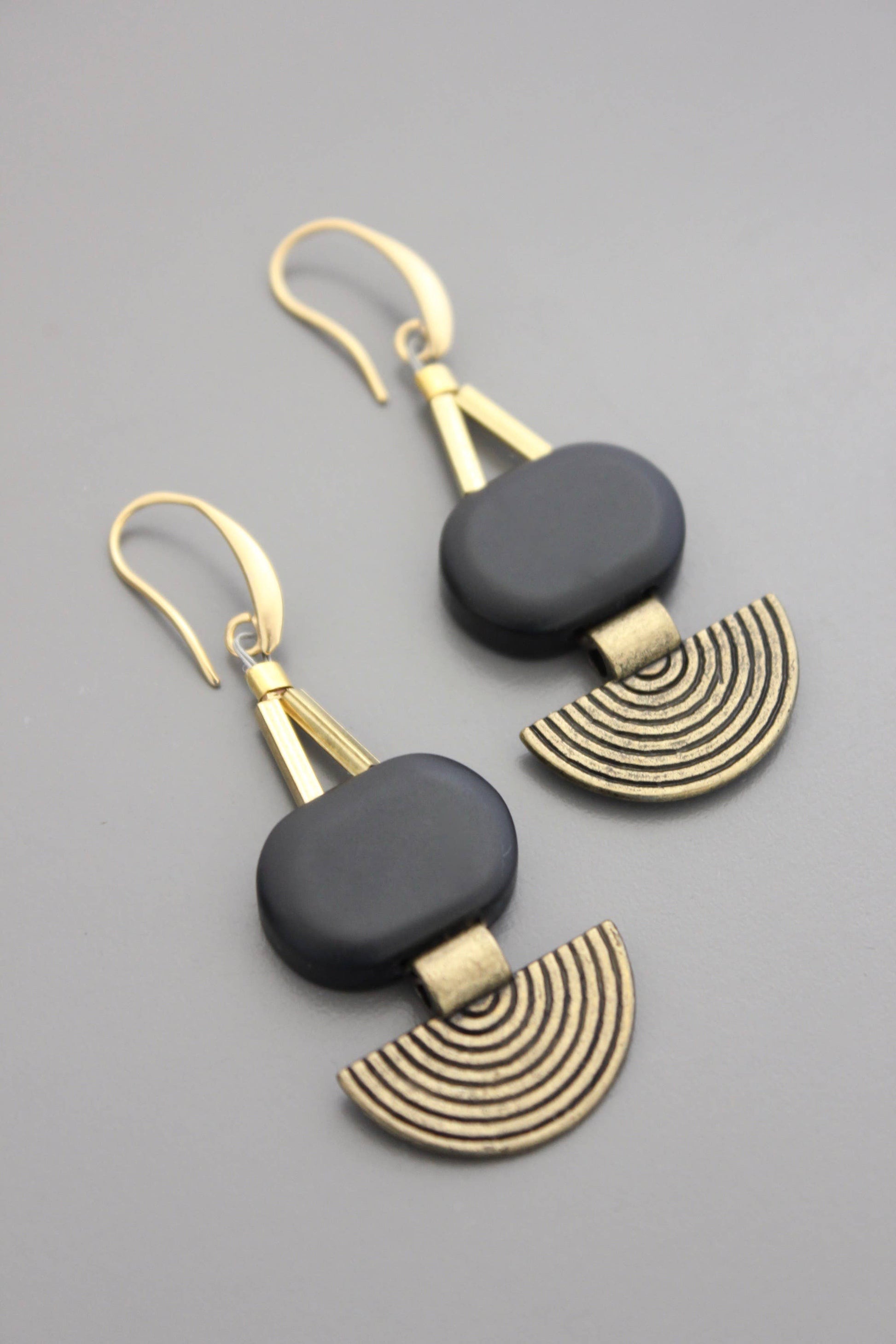 18k gold plated hook earrings with black agate and brass. 2.25 inches. All pieces are made to order and handcrafted at our studio in New Jersey by skilled artisans who share our passion for quality and originality. Each piece is unique so stones and glass may vary in shape, size, and color. Stone inclusions may be visible to the eye and are considered a part of their beauty. Our jewelry consists of plated metal, which may darken or tarnish over time with normal wear. Gently wipe the metal surface with a soft cloth to clean, however, excessive polishing may rub off or scratch the plating. Avoid direct contact with lotions, perfumes, or oils. Excessive light, heat, or moisture will deteriorate the quality of glass, plating, and stones. Do not wear jewelry while in a pool, hot tub, or bathing. If treated with care, your jewelry will last for years to come.
