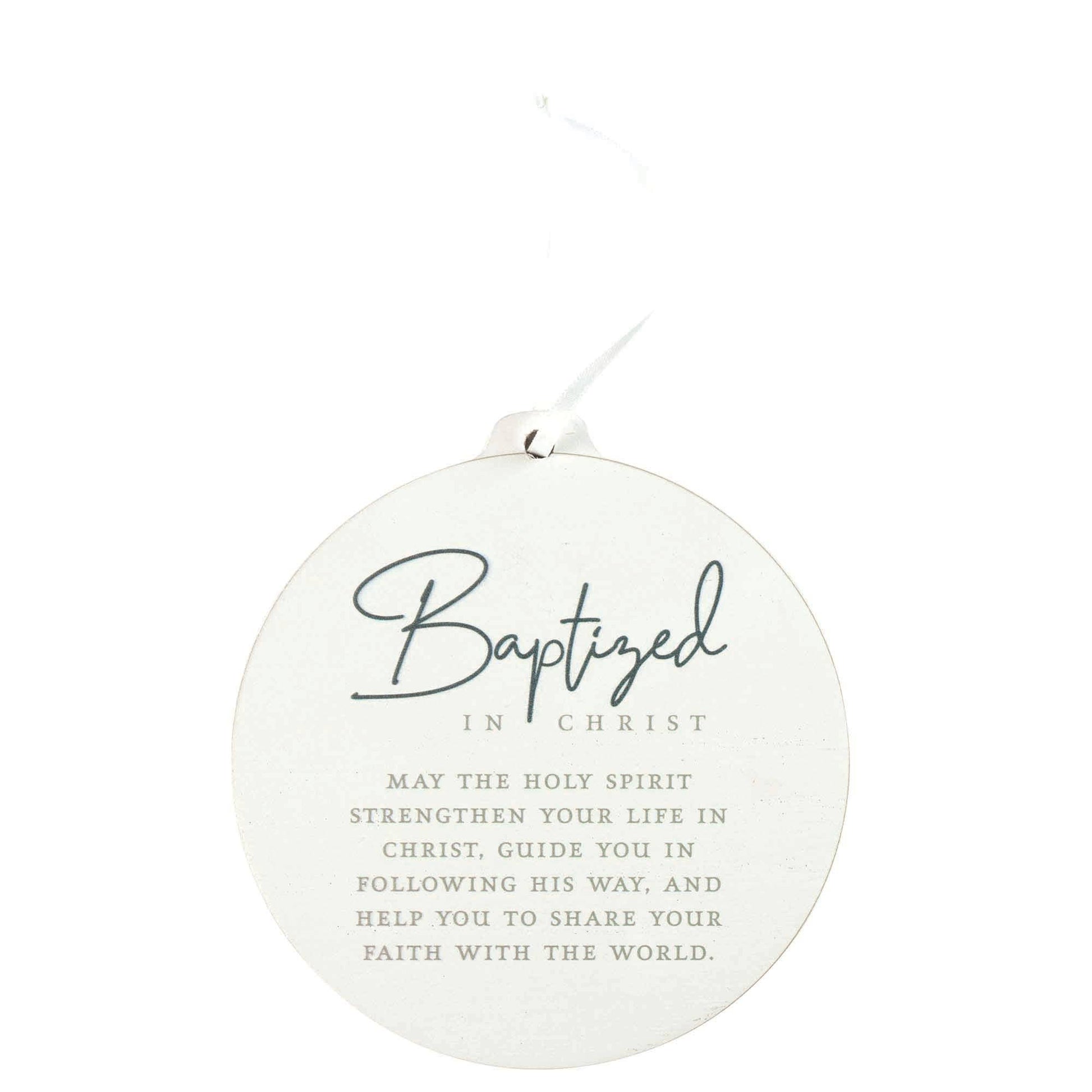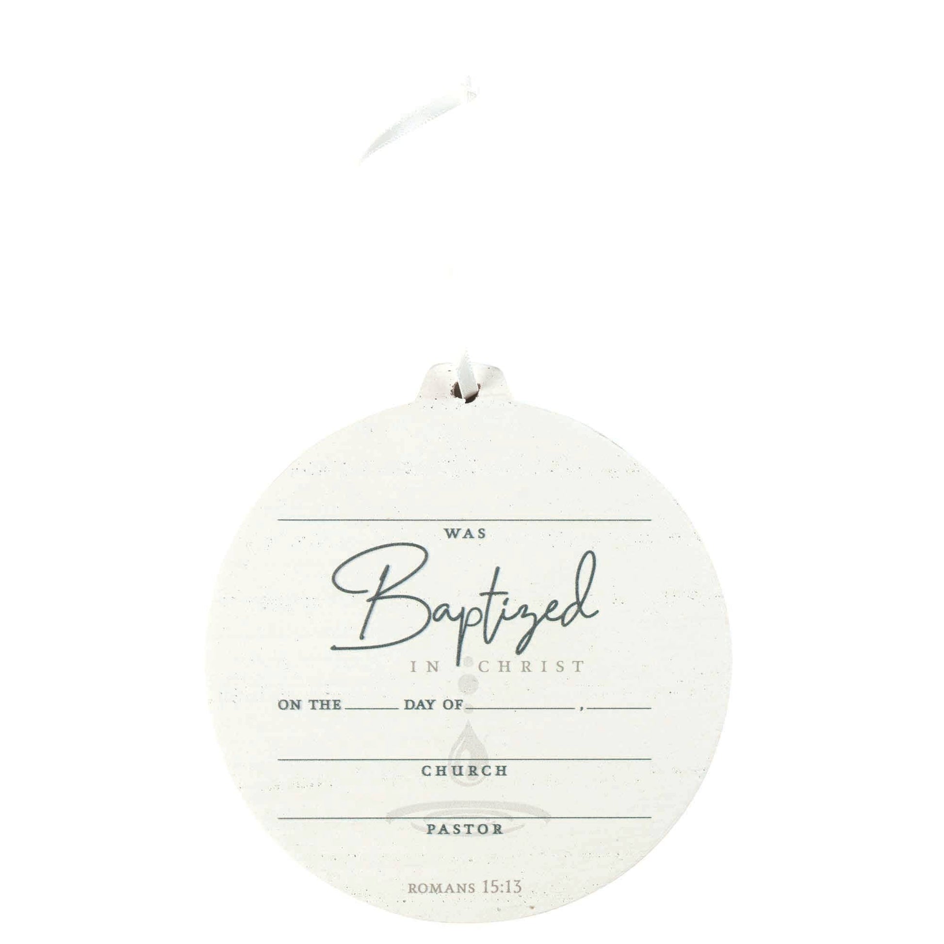 This Ornament Displays The Baptized In Christ Text: May The Holy Spirit Strengthen Your Life In Christ, Guide You In Following His Way, And Help You To Share Your Faith With The World. This Double-Sided Ornament Has Space To Write Information About The Special Baptism, With Romans 15:13 - This Overlays Water Droplets. 4in Diameter Ornament Is Made Of MDF Wood With A White Finish.