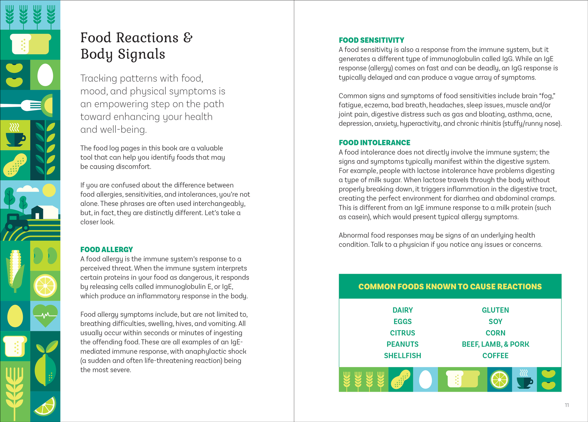 • Each daily spread features a Food chart on the left-hand page, for logging what you eat (plus optional nutrition info); and to note mood, sleep, hydration, and other wellness indicators.