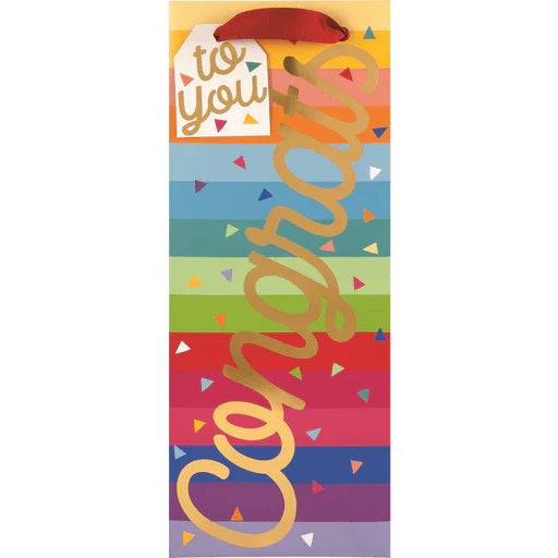 Celebrate any occasion with the Congrats Bottle Bag! This elegant and versatile bag is perfect for gifting wine or champagne. With its sleek design and sturdy handle, it adds a touch of luxury to any gift. Show your excitement and make a statement with the Congrats Bottle Bag!