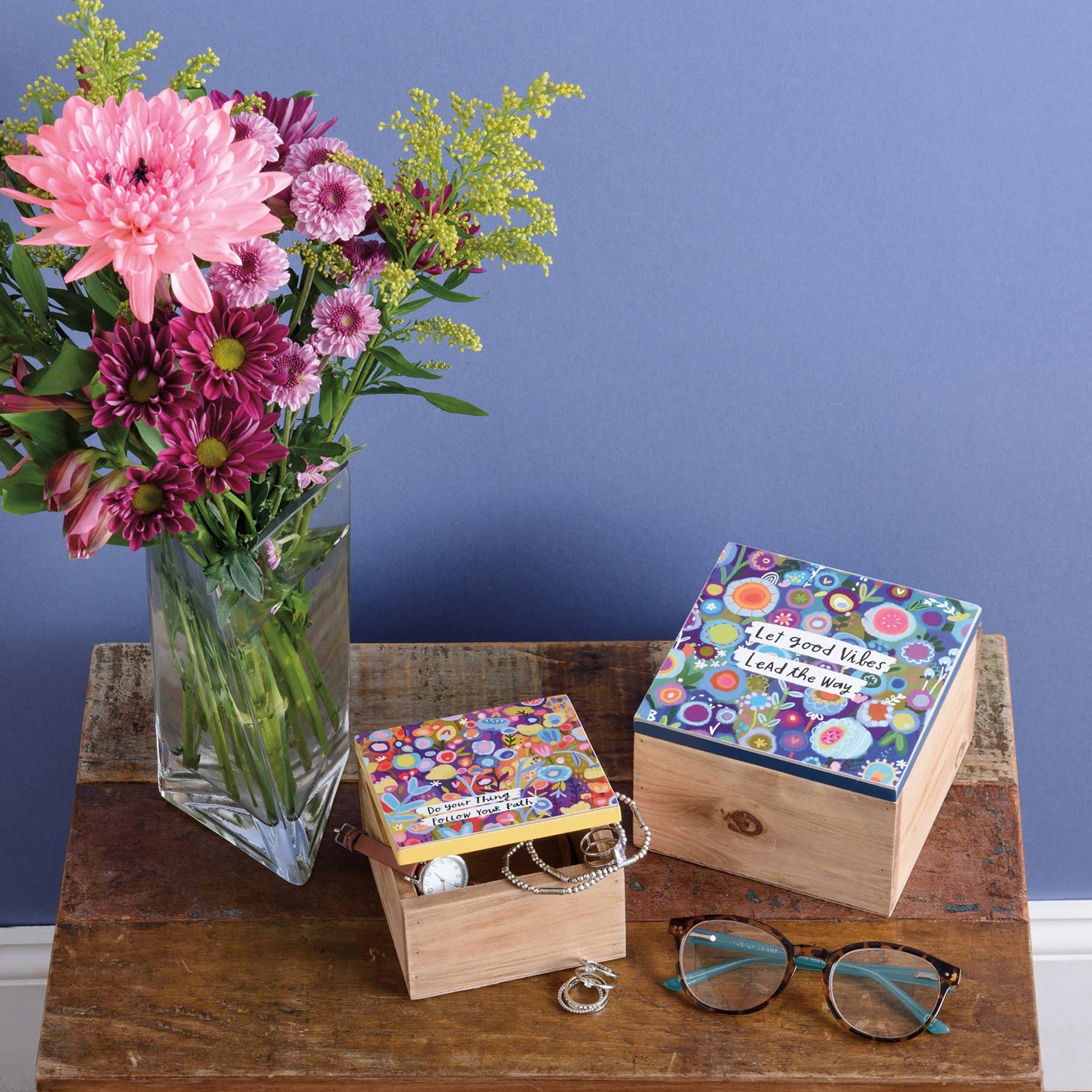 A set of two nesting hinged boxes featuring a vibrant color palette with whimsical floral designs and inspirational words. Small box features "Do Your Thing Follow Your Path" sentiment. Large box features "Let Good Vibes Lead The Way" sentiment. Edges of each lid feature complementing colors and sides of each box feature natural wood.