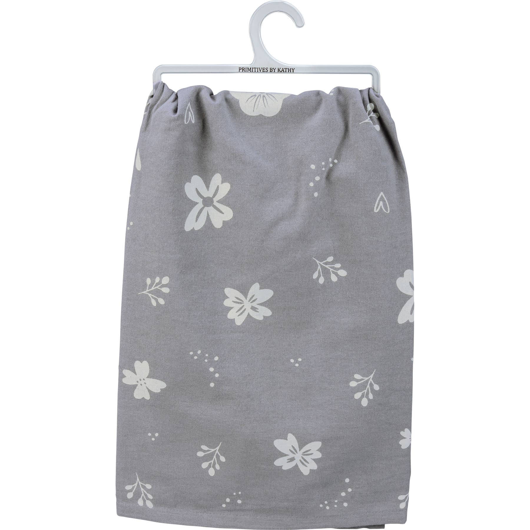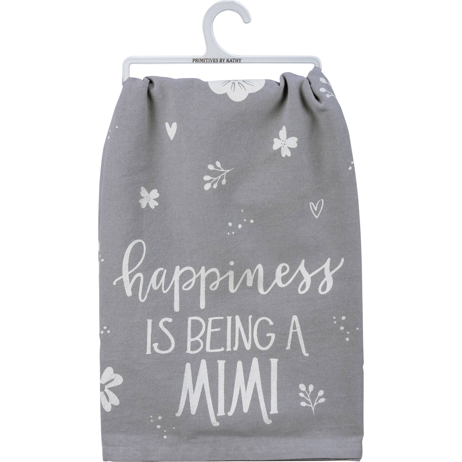 A gray cotton kitchen towel featuring an all-over floral design and "Happiness Is Being A Mimi" sentiment. Machine-washable.