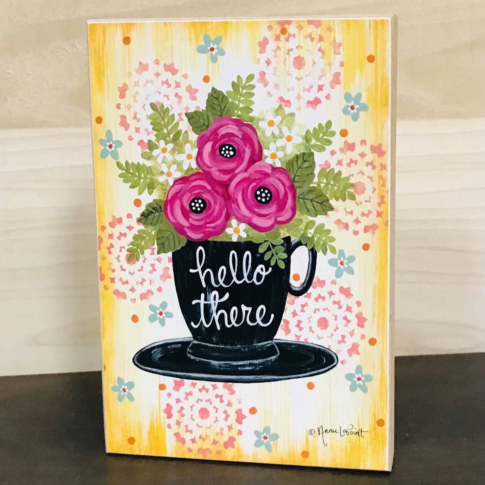 This block is called "Hello There" and it has a bright yellow and flower filled background with a coffee cup of large pink flowers and greens flowers. A great spring time or summer block sure to brighten up any shelf! The 6x4x1 size makes it perfect to display on table-top, shelf or mantle.