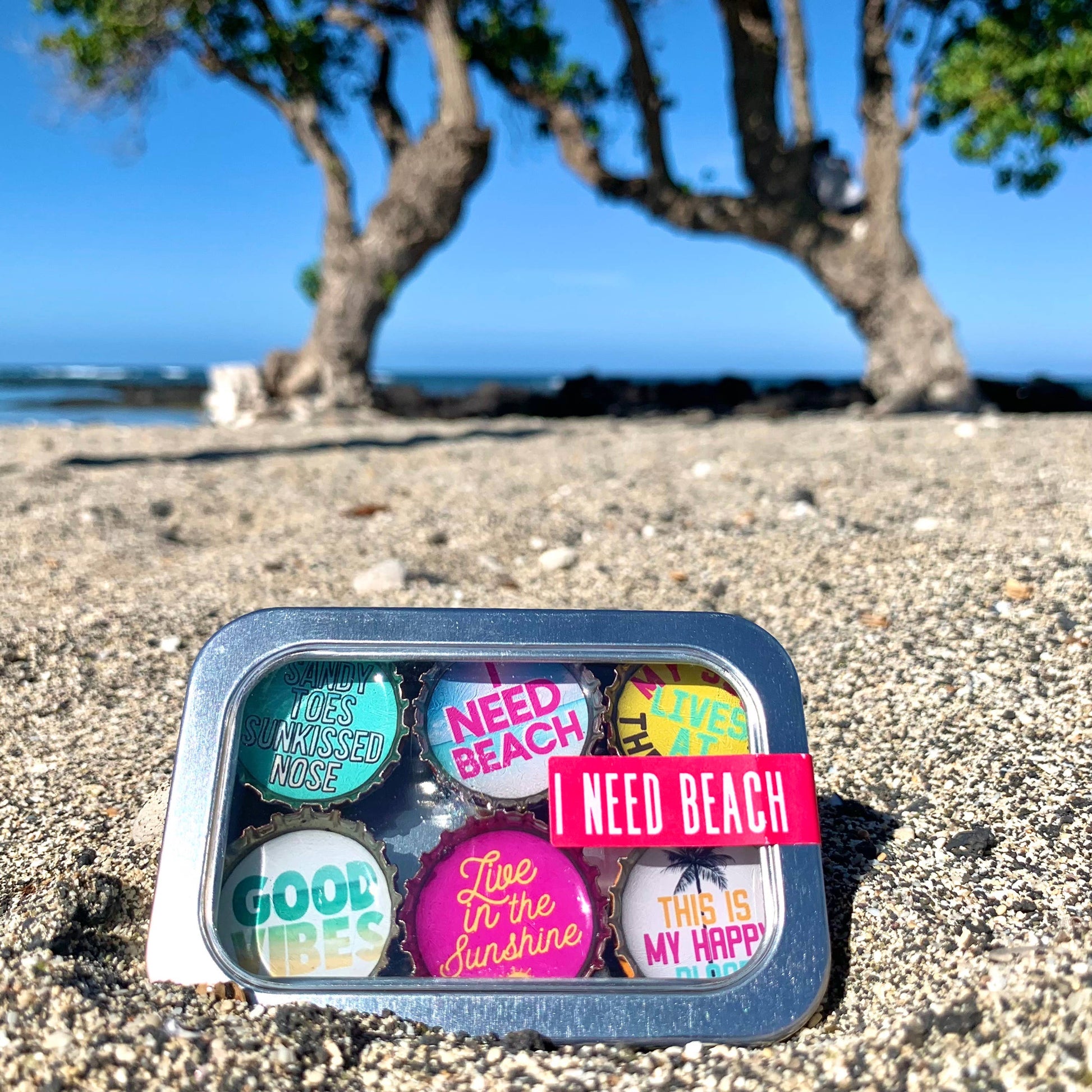 spring decor. Handmade, woman owned, eco-friendly magnets made from upcycled bottlecaps. We pour eco-conscious epoxy over the image creating a glassy finish. Perfect for any ocean, beach, Hawaii, Florida, California, and more shops. Six-pack set of I Need Beach themed magnets, made in the USA from recycled bottle caps. Our magnetic expressions make fabulous and unique gifts and can be used in the kitchen, office or on any magnetic surface. Each magnet set comes in the display tin (just like in the picture) and the magnets are strong enough to hold the entire tin on a magnetic surface for display.