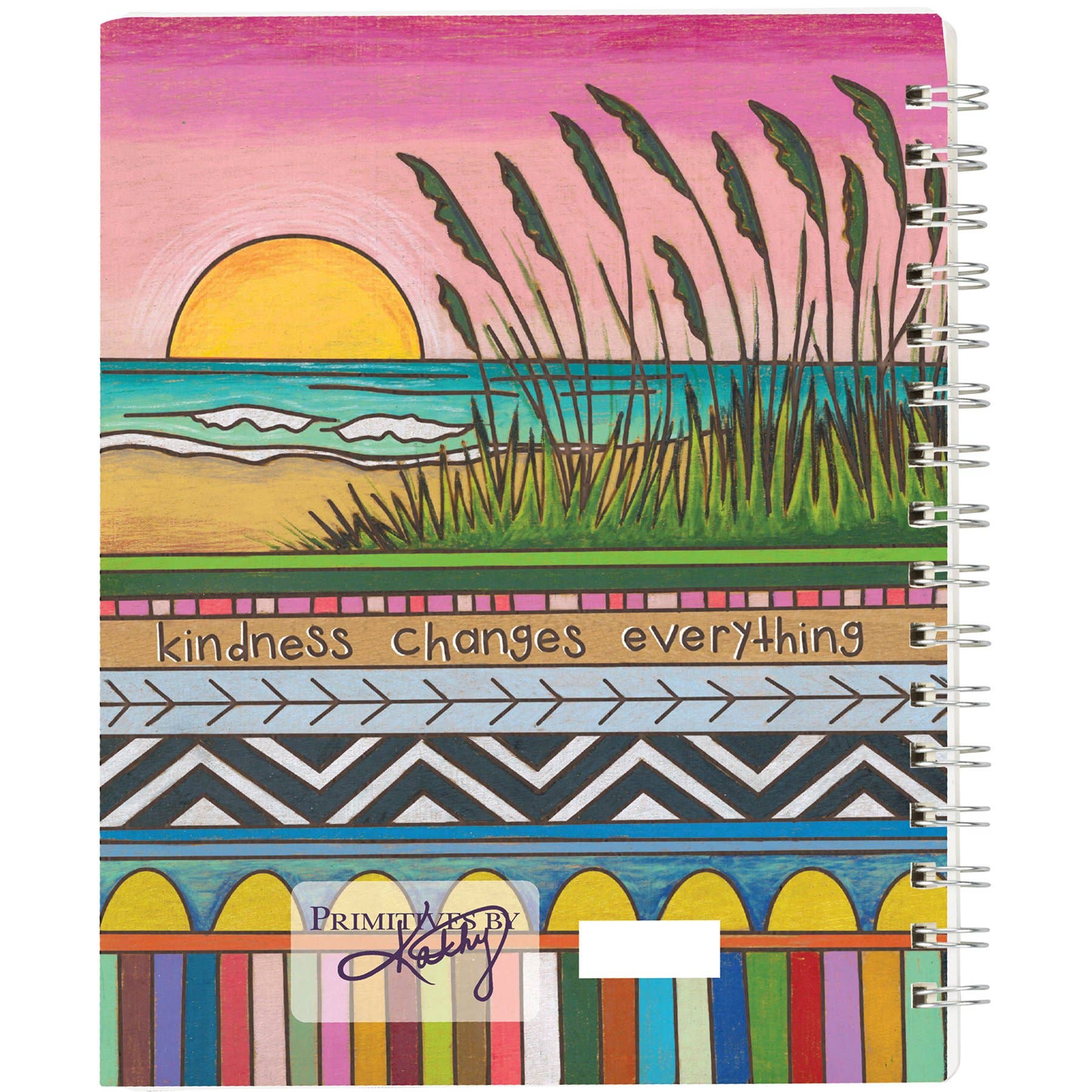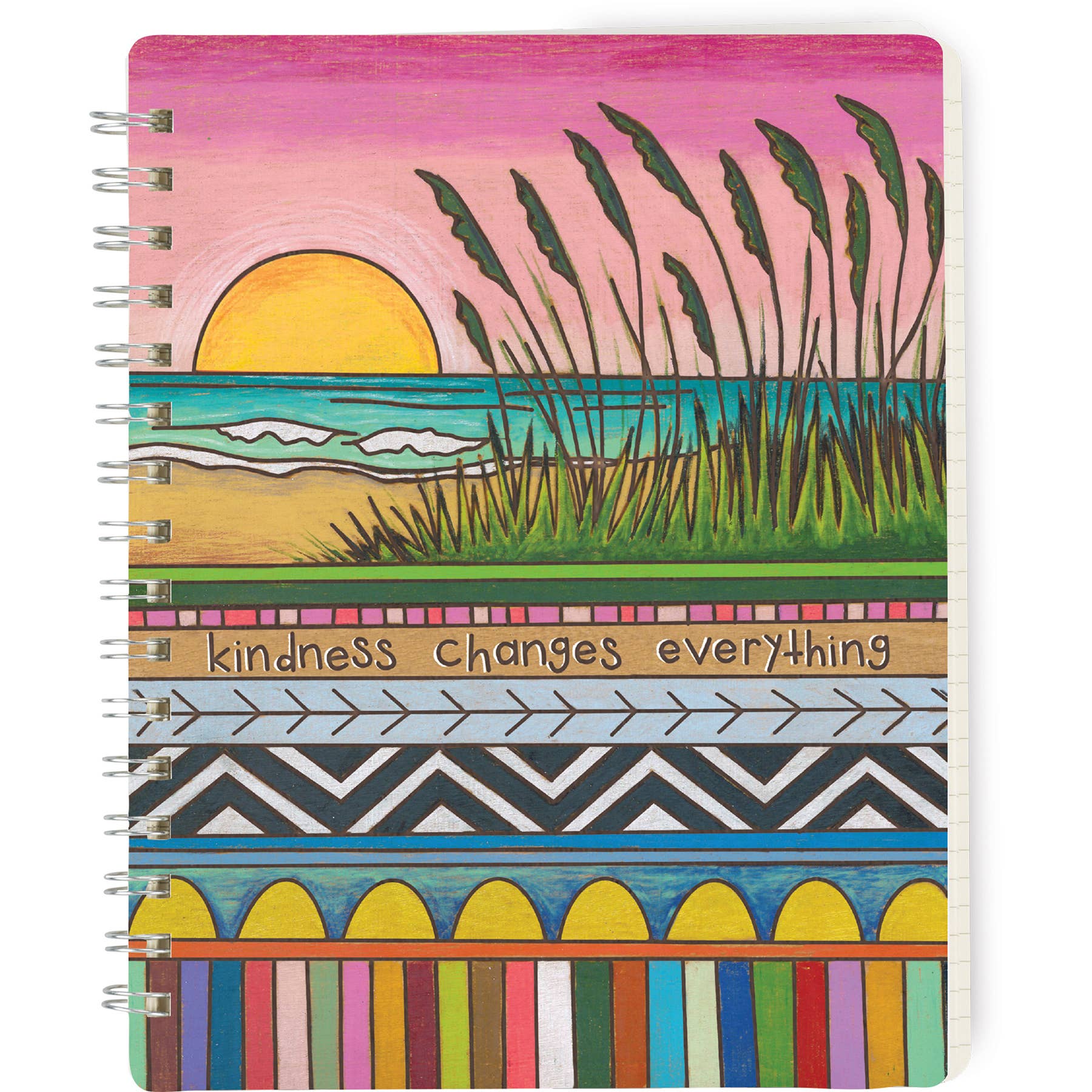 A double-sided spiral notebook featuring printed replications of colorful wood burned designs with "Kindness Changes Everything" sentiment. Our Kindness spiral notebook contains 120 lined pages.