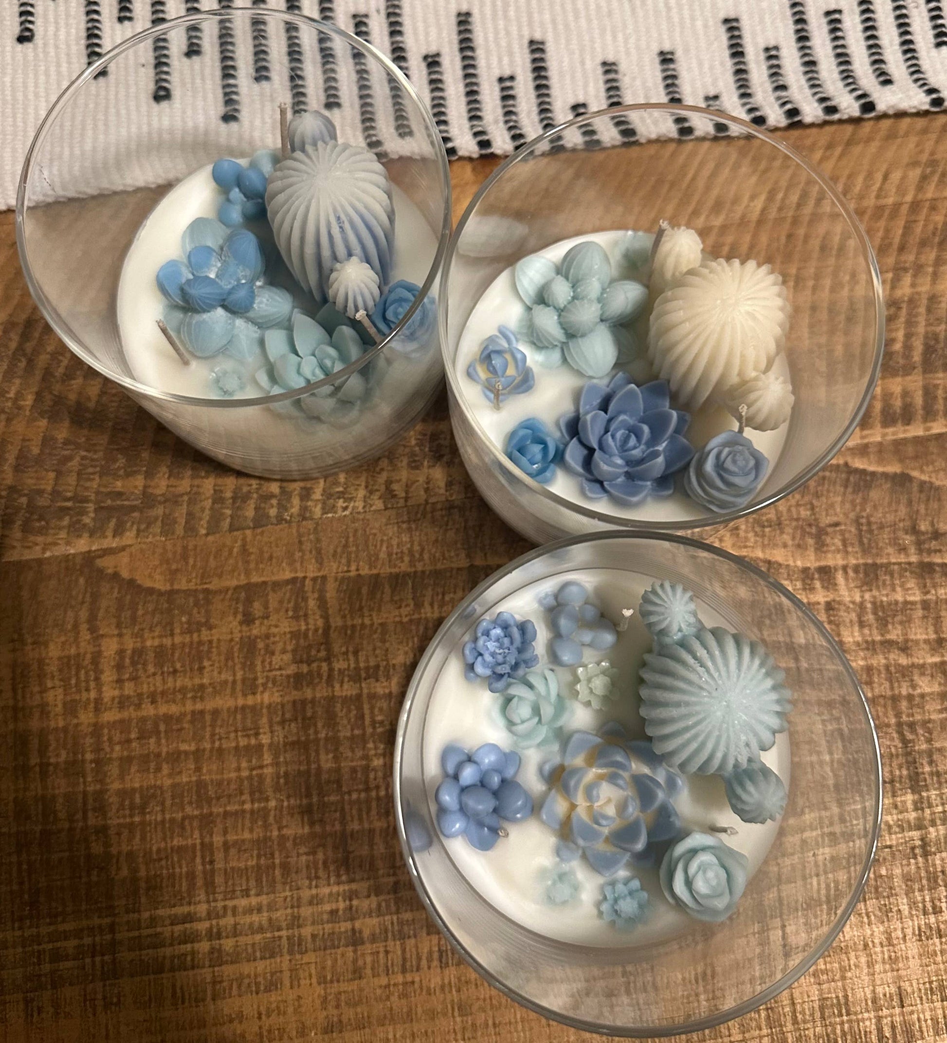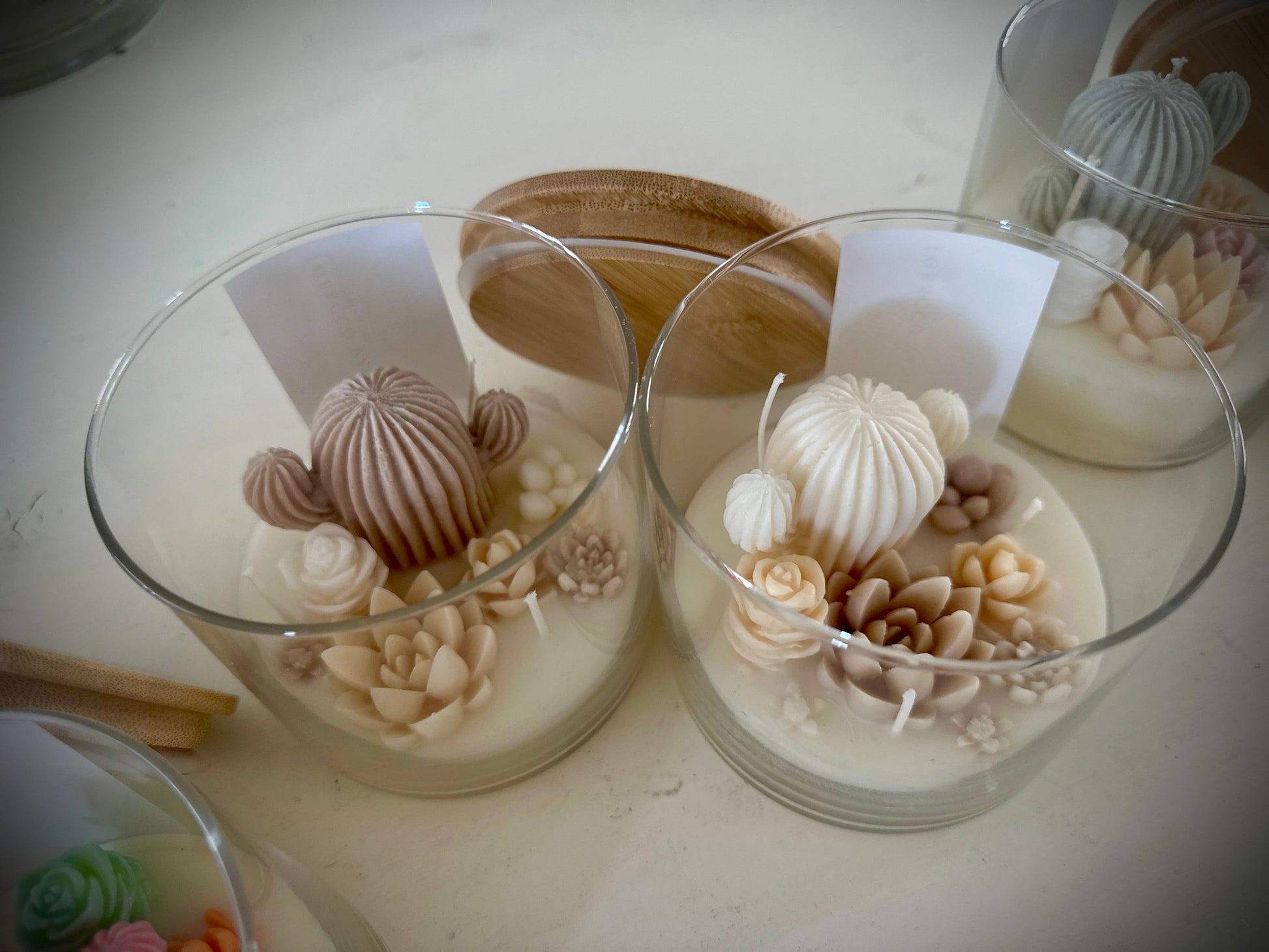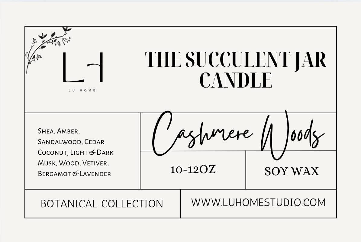 Our 3 wick Succulent Jar scented candle. Handpoured in small bathes and hand crafted with love. We put much though into each succulent arrangement and color scheme. The Succulent Jar from our signature Botanical Garden Candle Collection, is now in a terrarium style, featuring not one, but TWO new fragrance options, Flora & Cashmere Woods. A combination of aesthetic design and fragrance. This will make a great housewarming gift, an accent decor piece for home, wedding or events. This is an absolute must have and a wonderful gift idea for any time of year. About this product Handmade & hand poured Soy wax 3 cotton wicks Bamboo lid: 4” Jar size: approx 3.63” H x 4” W (please note, that succulents colors may vary, but will be similar in likeness, each color scheme is designated to a specific fragrance, also available Unscented in an all white succulent garden design, aka Clear.)