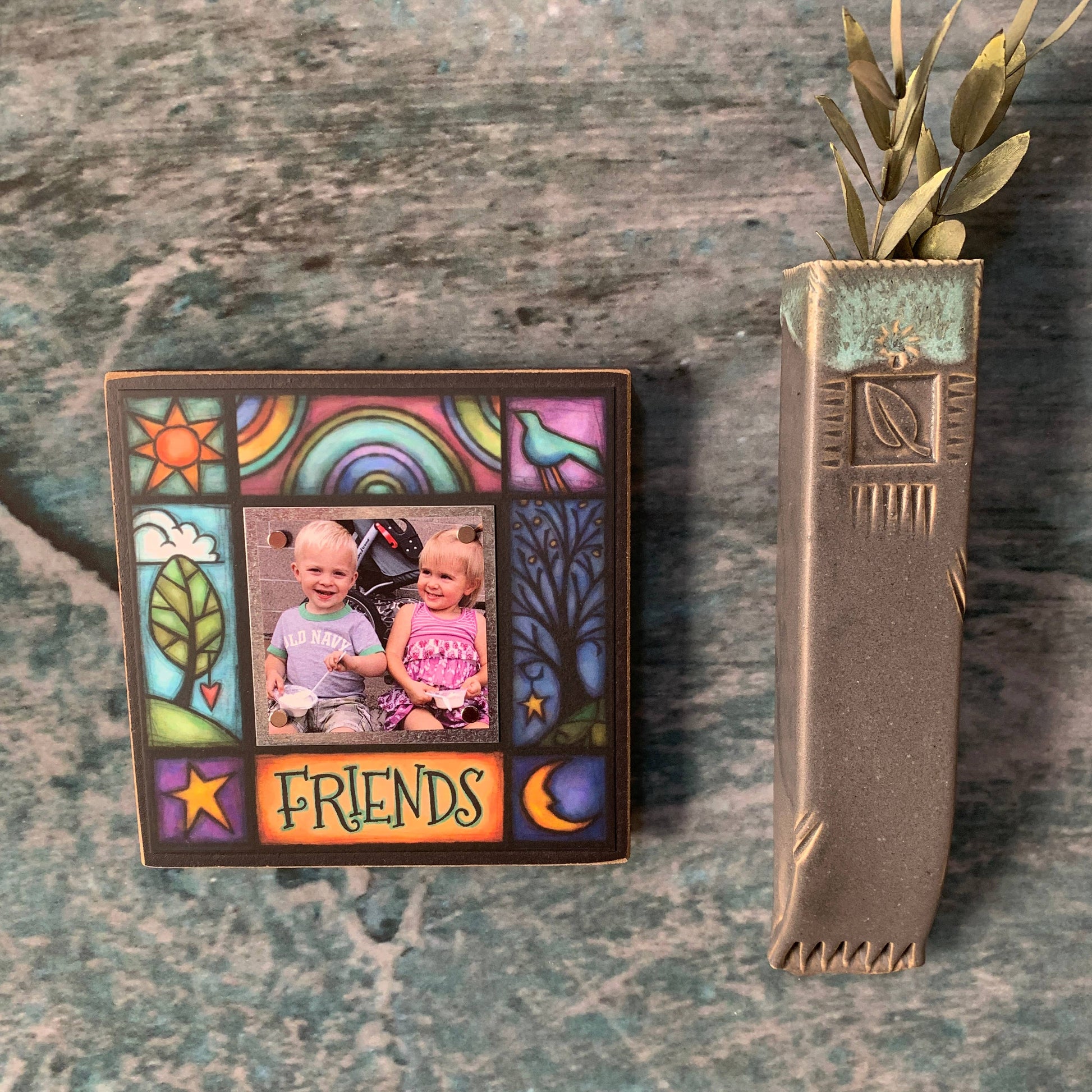 Frame featuring the artwork of Michael Macone with quote, "Friends". This 5.25" x 5.25" wood frame holds a 2" x 2" photograph on a sheet metal square with four super-strong rare earth magnets. It is printed with archival ink on archival paper which is attached to wood and UV coated to last a lifetime. Frame can hang or stand with included peg.