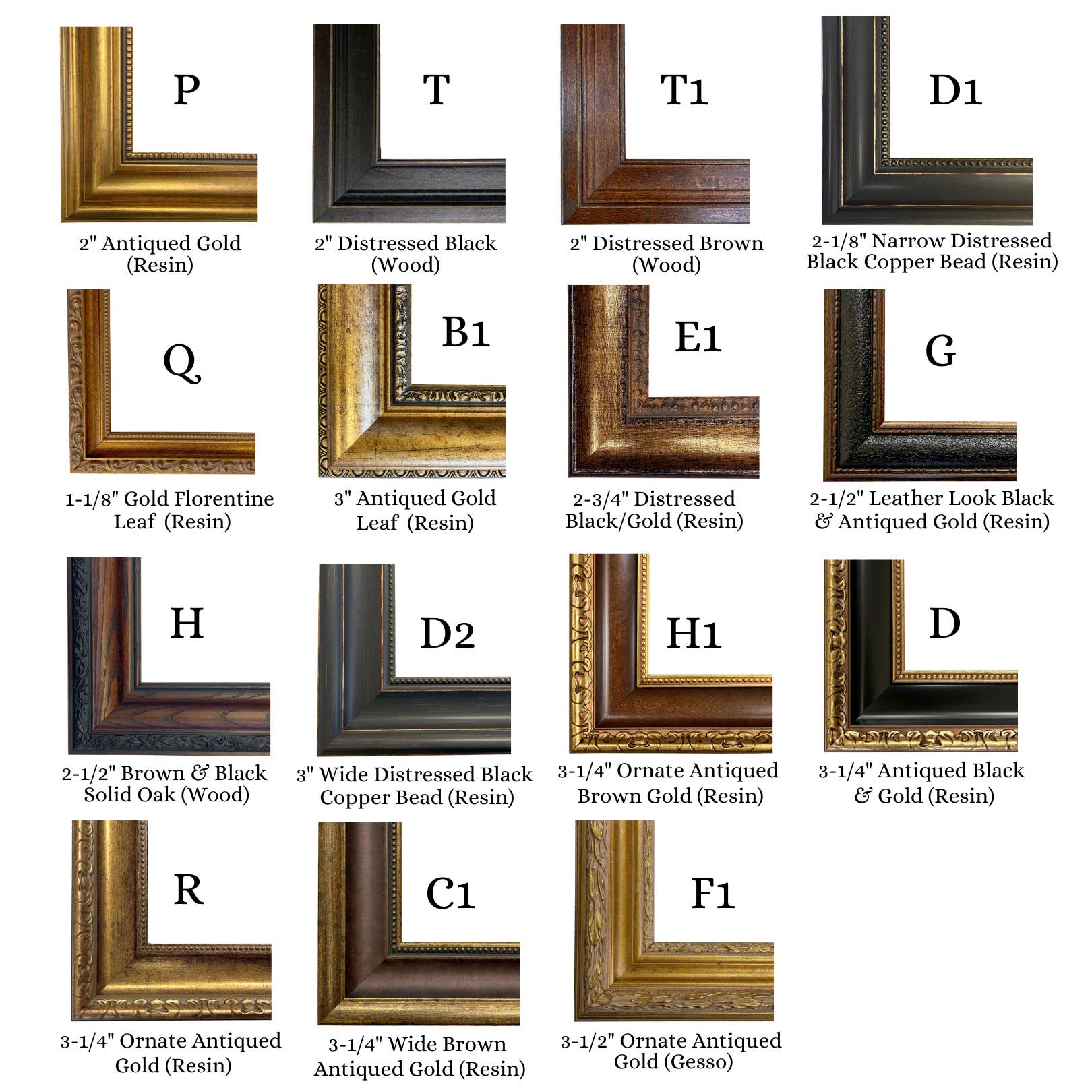 Each high-resolution image is printed in-house with archival quality ink on matte canvas, board-mounted, then treated with a special varnish to give it a more authentic oil painting look. Each work is custom framed in our shop, and the back is finished with 100% recycled craft paper and a sawtooth hook or wire hanger.