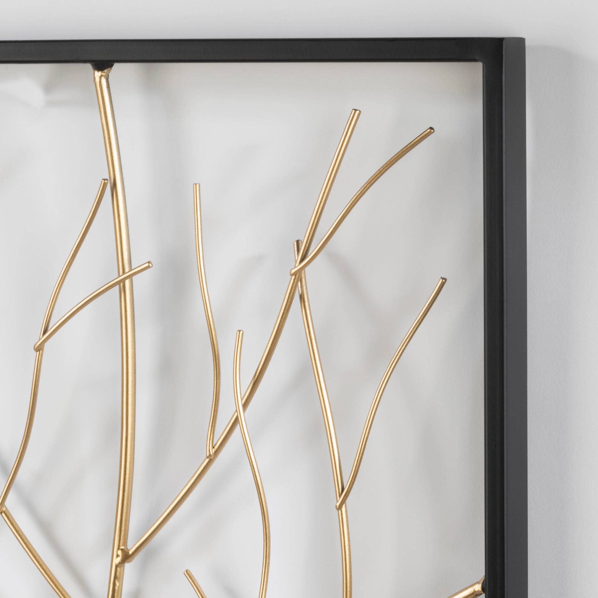 This metal wall art features a gold tree branch surrounded by a black metal frame. It's not only an eye-catching art piece to hang on the wall, it can also be used to hang and organize jewelry. Hang two together to create a focal point on any plain wall!