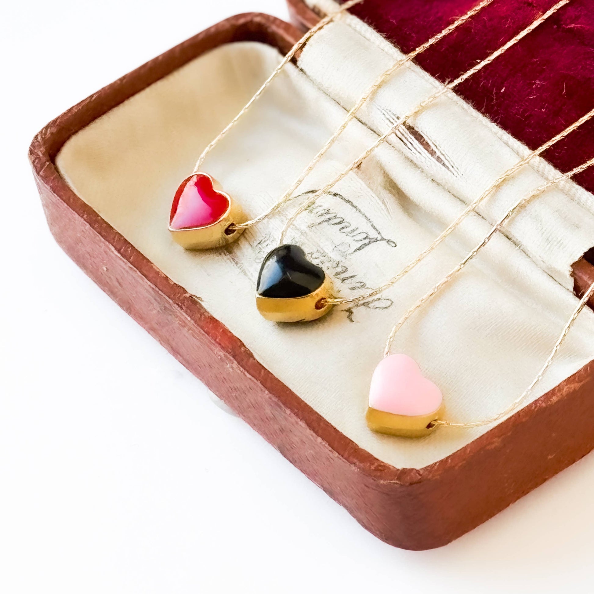 A 9mm Gold Plated Enamel Heart hanging on a 14K Gold Filled chain, Finished with a lobster clasp.. The Details: 14K gold filled chain 9mm gold plated enamel heart Lobster clasp Handmade in Burlington VT
