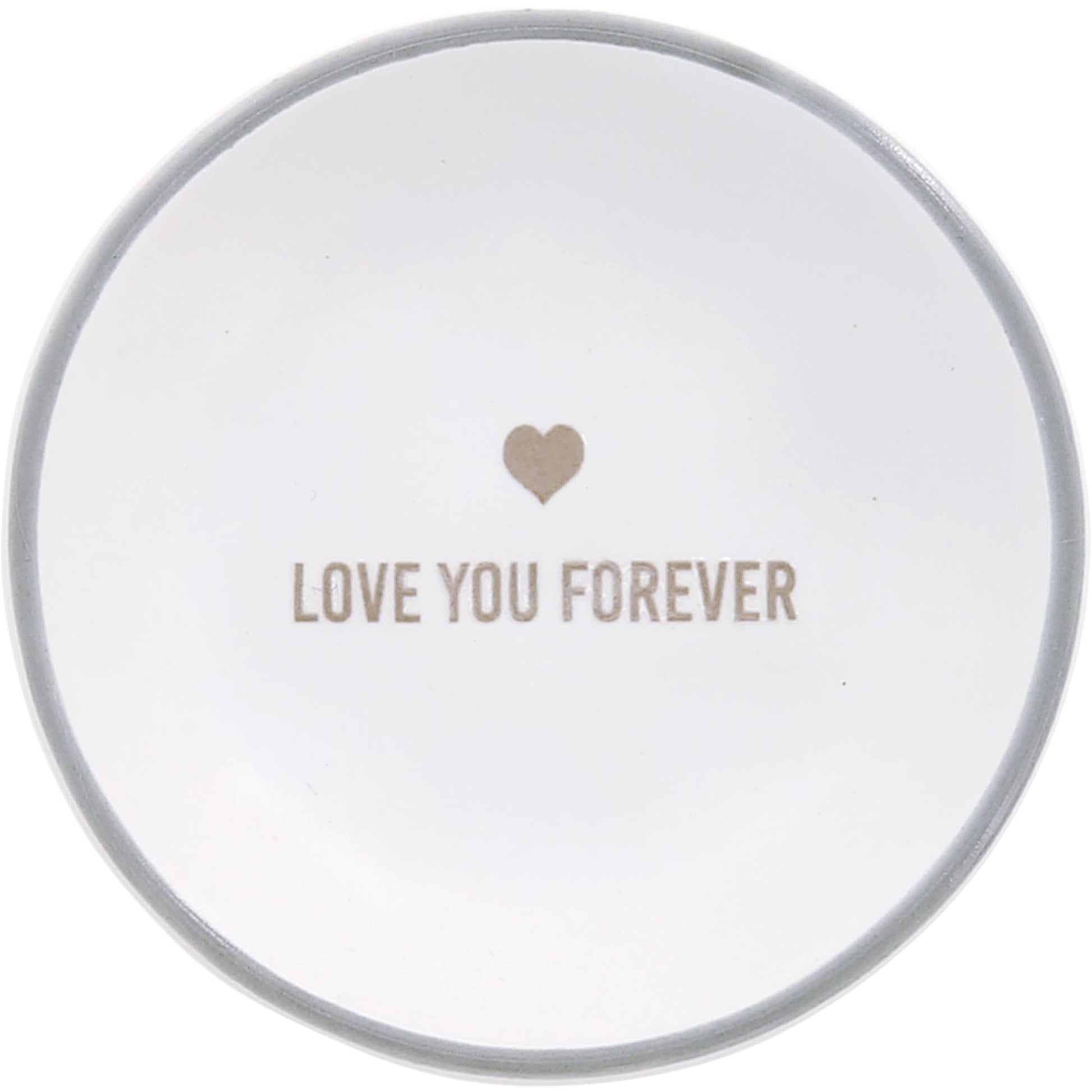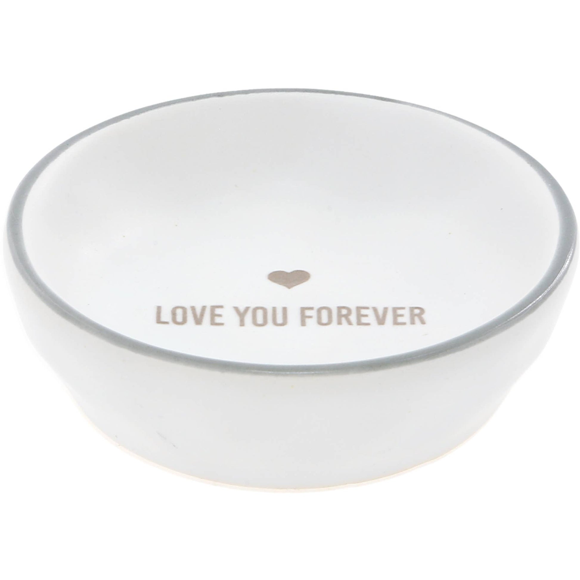 This 2.5" diameter x .75" deep keepsake dish is the perfect size for holding small, delicate jewelry items, including rings, earrings, necklaces, and bracelets. It can also keep desk items such as paper clips and push pins secure. It can even be used in the bathroom for hair clips, hair ties, or bobby pins. The finish is matte white with a glossy gray brim. The gray "Love You Forever" glossy risen sentiment is accompanied by a heart. Wipe clean with a damp cloth. The Keepsake box is packaged securely in a die-cut box for safe shipping. This is a beautiful option for your spouse/significant other, husband/boyfriend, or wife/girlfriend for Valentine's Day, anniversaries, engagement/wedding celebrations (for fiances or fiancees), and more. Celebrate your love for one another daily.