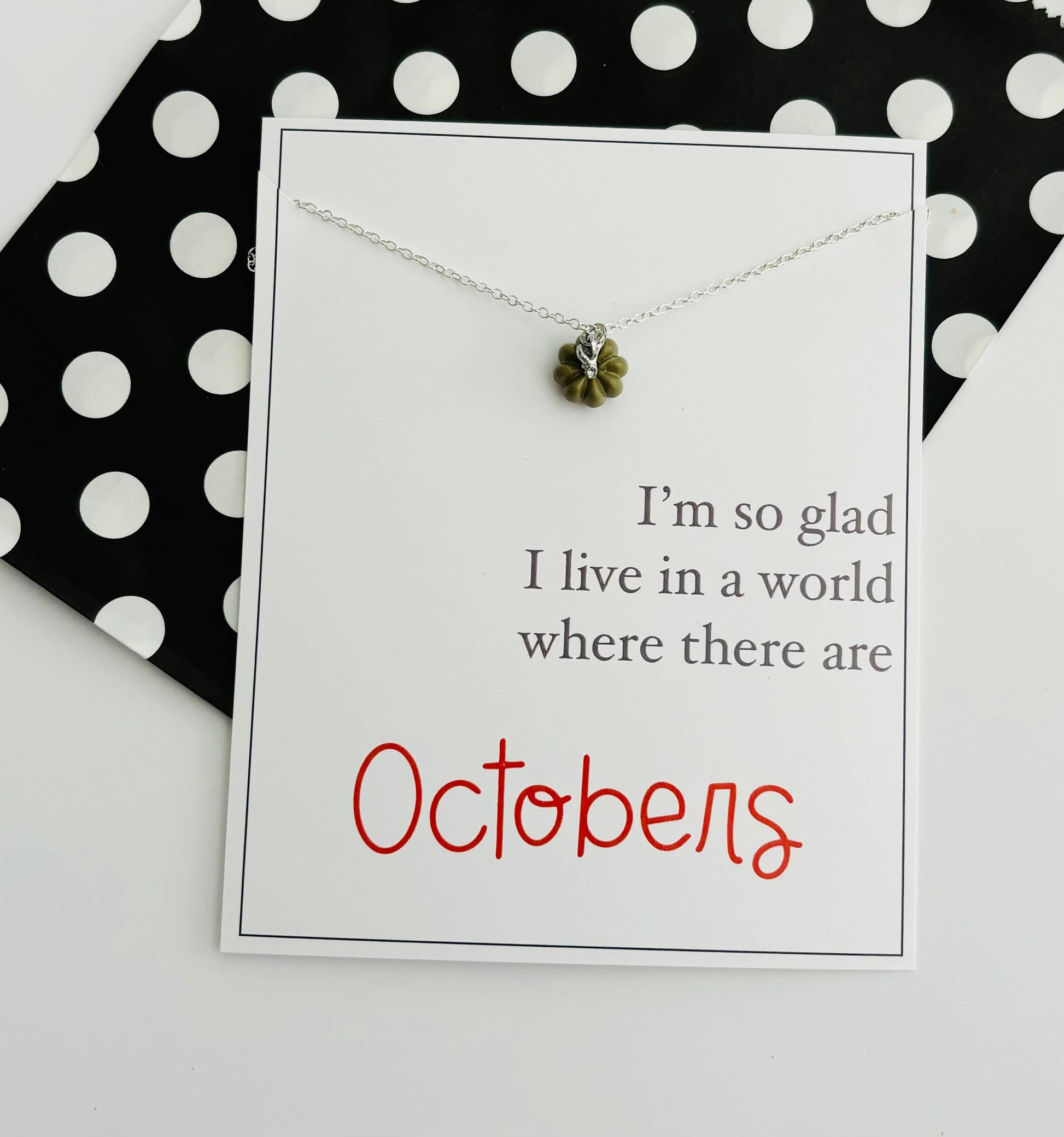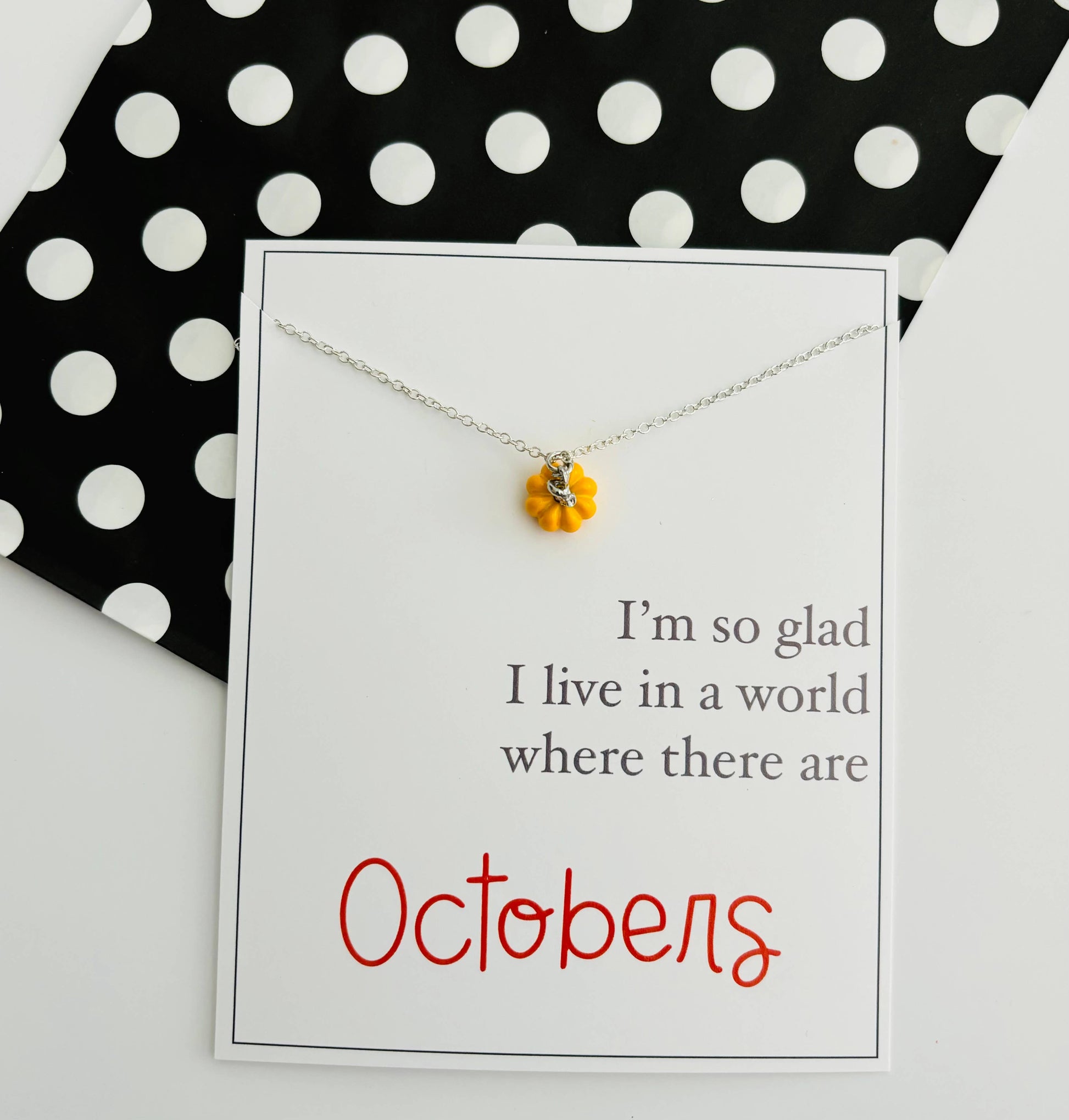 Celebrate October and the Halloween season, with these dainty, on trend pumpkin necklaces on stationery cards! The stationery gift card reads, " I am so glad I live in a world where there are Octobers!" Surprise that special friend, teacher, family member with this stunning necklace! We all LOVE this Anne of Green Gables quote! Handmade in Lehi, UT Necklace is approx. 20 inches long and made with silver plated alloy metal.