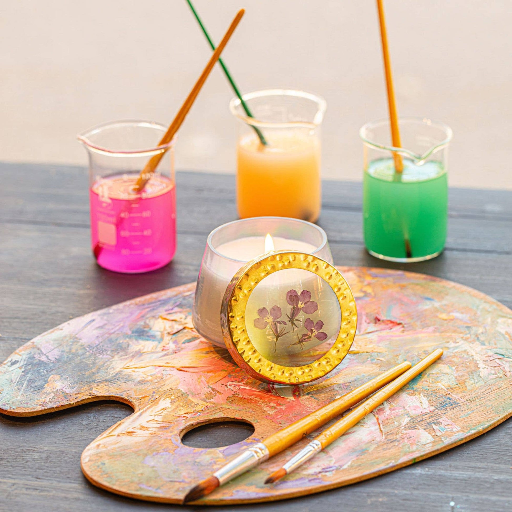 Wicks: 1 Ounces: 4.5 Burn Time: 35 Hours Dimensions: 2.5"H, 2.75" Diameter Fragrance Notes:Fizzy Mandarin, Gooseberry, White Fig, Nutmeg, Patchouli, Vanilla Lid Botanicals: Lobelia Product Description: Our pressed floral candles feature dreamy floral tableaus displayed between panes of glass. Hand poured with a coconut wax blend. Lovingly handmade in Colorado.