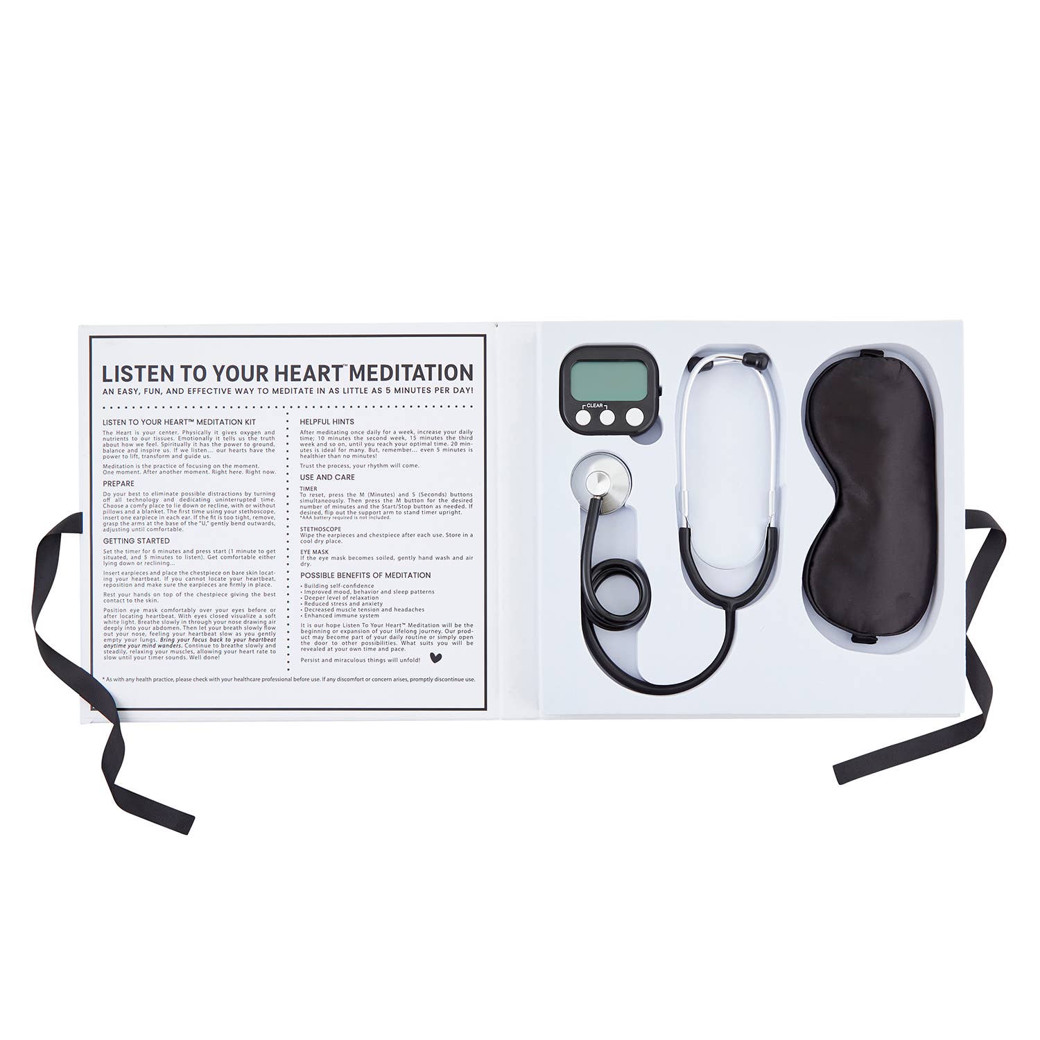 Listen To Your Heart Meditation Kit is an easy, fun, and effective way to meditate in as little as 5 minutes per day. This set includes a Stethoscope, Eye Mask, Timer, and Easy Start Guide.