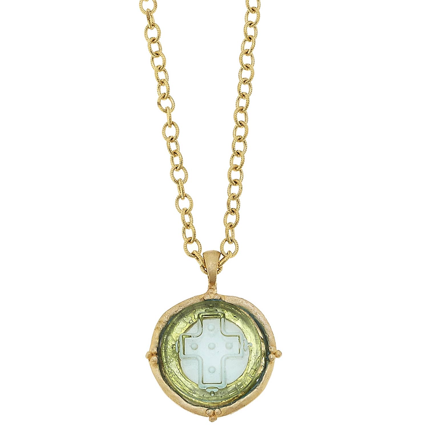 Chain: 30"; pendant: 1.5" diameter; closure: lobster clasp.