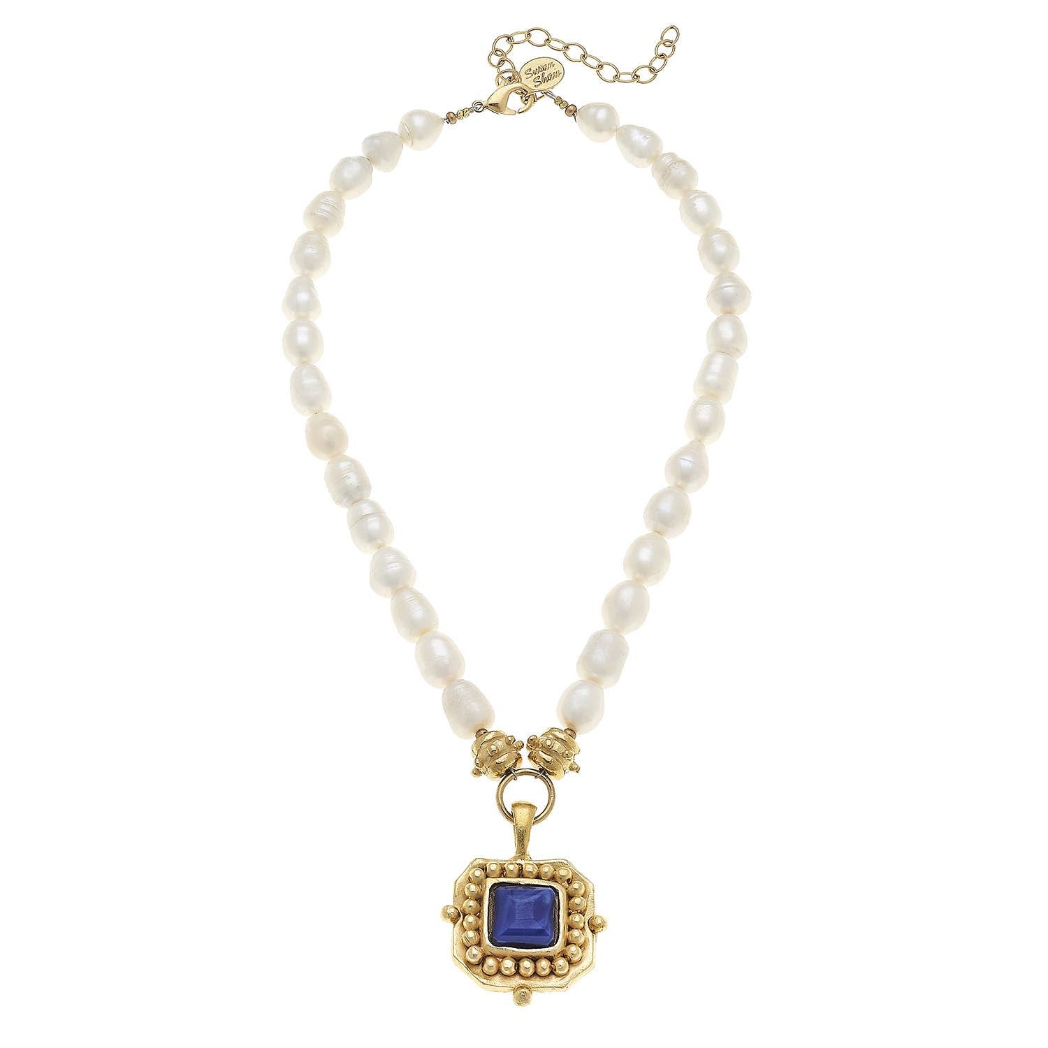 Experience the elegance of Susan Shaw's Gold Blue Crystal Pendant on Genuine Freshwater Pearl Necklace. This Pendant/Charm Necklace is a testament to over three decades of unique and elegant design philosophy. Handmade by experienced artists in a boutique workshop in San Antonio, TX, it embodies the highest quality plating methods, semi-precious stones, and cultured pearls. This necklace not only reflects Northern European styling influences but also caters to the needs and desires of our customers, ensuring an exquisite design made from American materials.