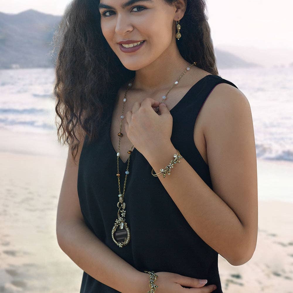 Peer through this elegant lorgnette magnifier to bring quick focus to a menu or label. The optical quality acrylic lens is set within a frame of dimensional flowers, leaves and scrolls. The neutral palette of opal, smoke and clear crystal are also the colors of beads in the neck chain, including natural freshwater pearls. Finished in burnished bronze. A beautiful blending of fashion and utility. Designed and made in our Los Angeles studio.