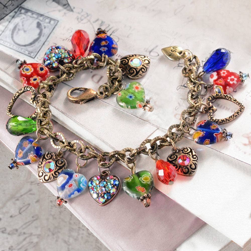 Easy to love Millefiori glass candy heart charm bracelet holds a rainbow of colors. Hearts of cobalt blue, red and green have tiny, infused flowers, which occurs randomly in the molten glass. No two hearts will be identical. Five heart charms are set with vintage multi-color aurora crystal. Faceted crystal teardrop beads join the fun in matching colors. A substantial etched link rolo chain holds the 19 charms and is adjustable 8" and smaller. Finished in warm bronze. Made in our Los Angeles studios and signed Sweet Romance Jewelry, USA Style BR583