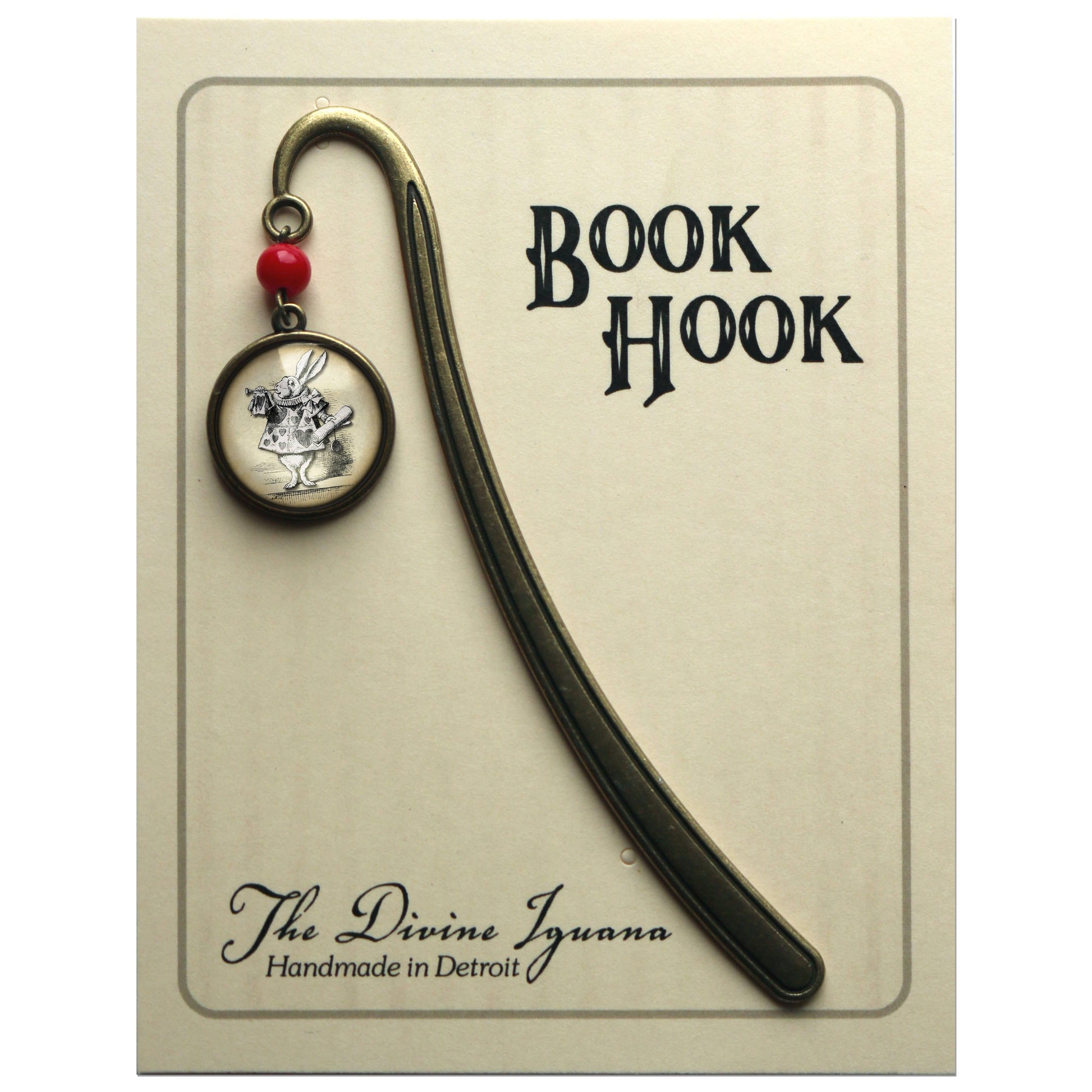 Sturdy bronze bookmark with dangling accent. *Bronze accent is about 1" in diameter *Glass cabochon image is .75" (about the size of a quarter) *Bead style may vary slightly. Book hooks work by sliding the long metal shaft down between the pages of your book like a traditional bookmark, allowing the accent to dangle along the spine. Hook is about 4" long.