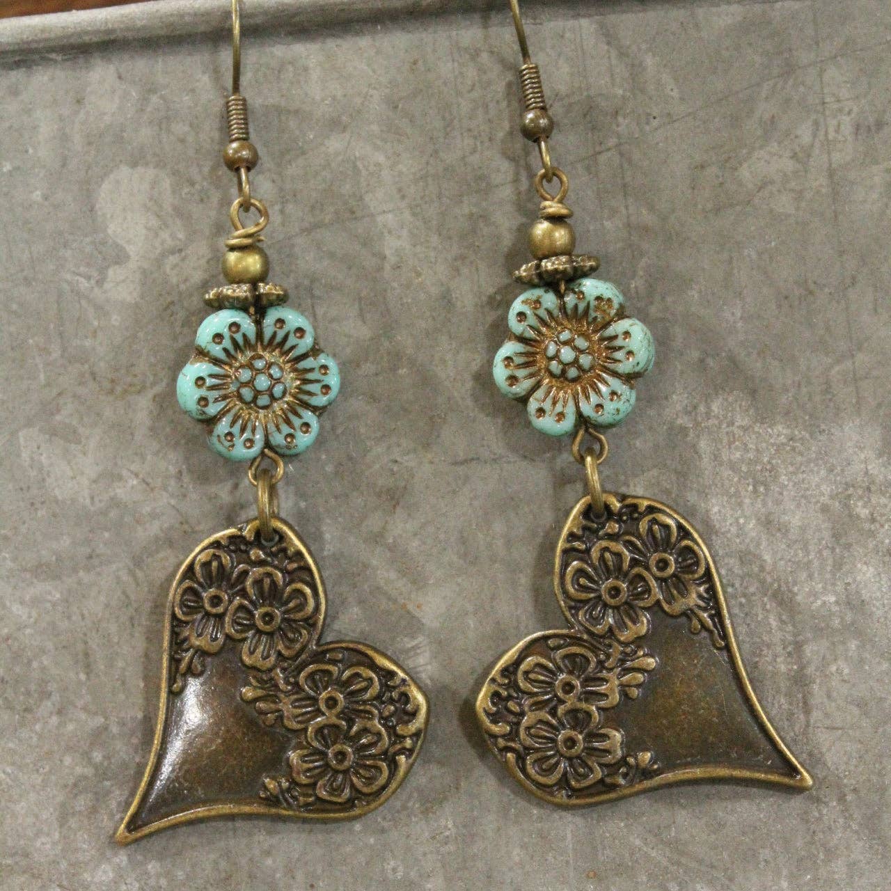 Czech & Bronze Mint Heart Charm Dangle Earrings