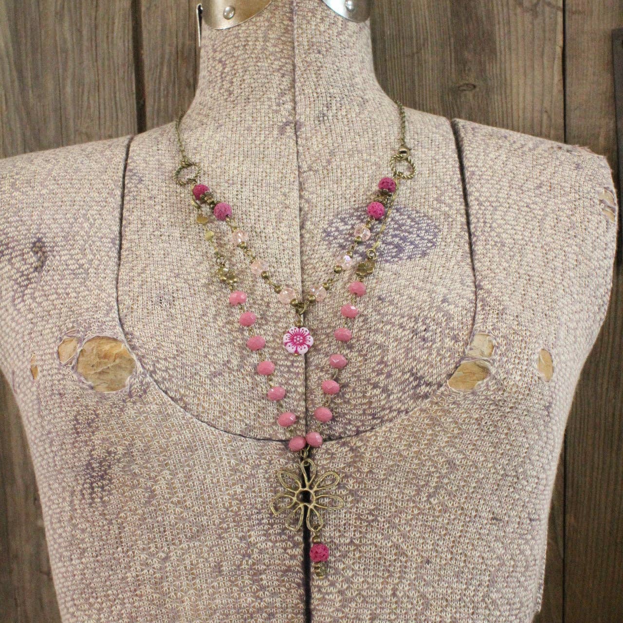 Flower Power Pendant Czech Pink Beads Layered Necklace